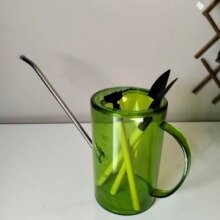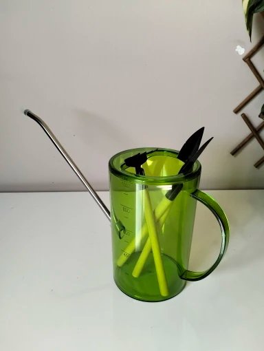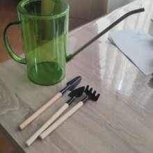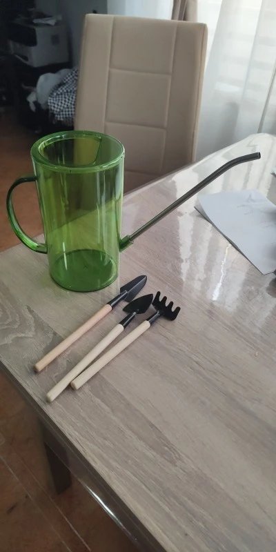 Excellent watering can for flowers, everything arrived intact and the set also included small shovels and a rake. I am very pleased. Thanks to the seller.