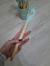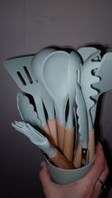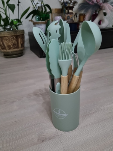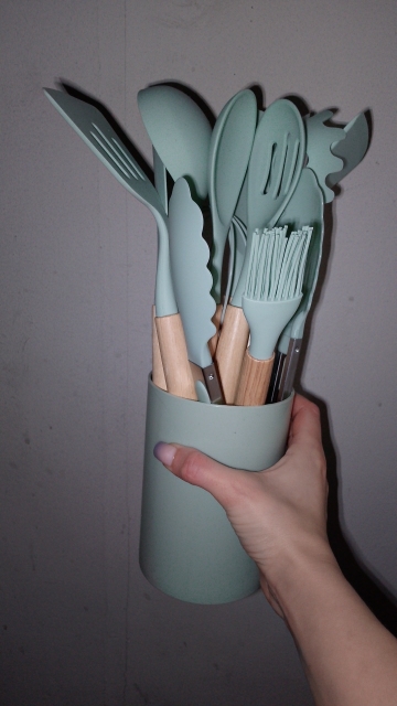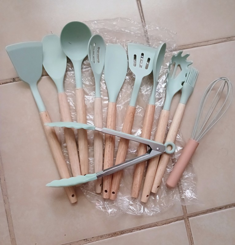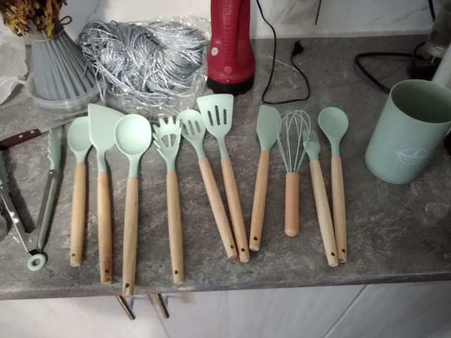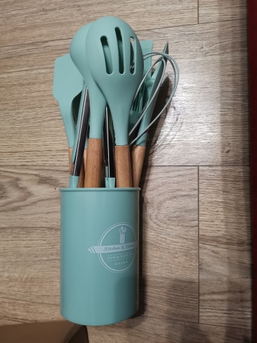Fajny zestaw łyżek, trochę miał specyficzny zapach, ale po myciu jest ok. W zestawie jest kilka różnych łyżek, szczypce i rózga do ubijania.