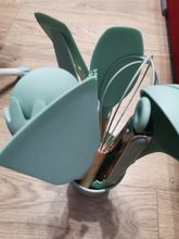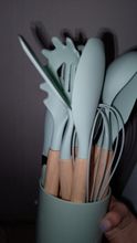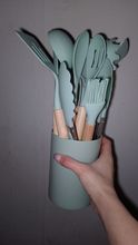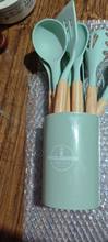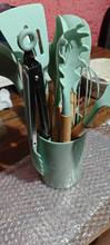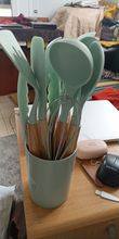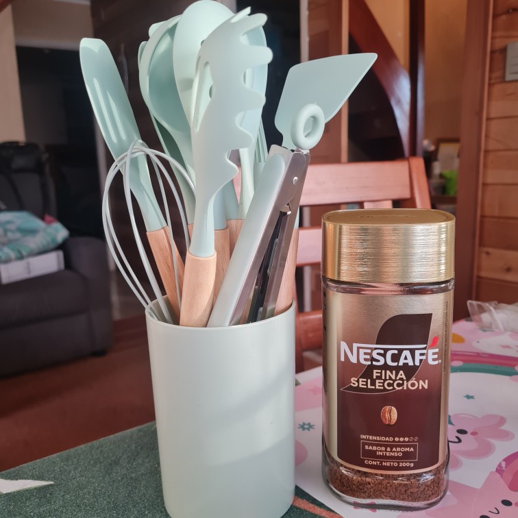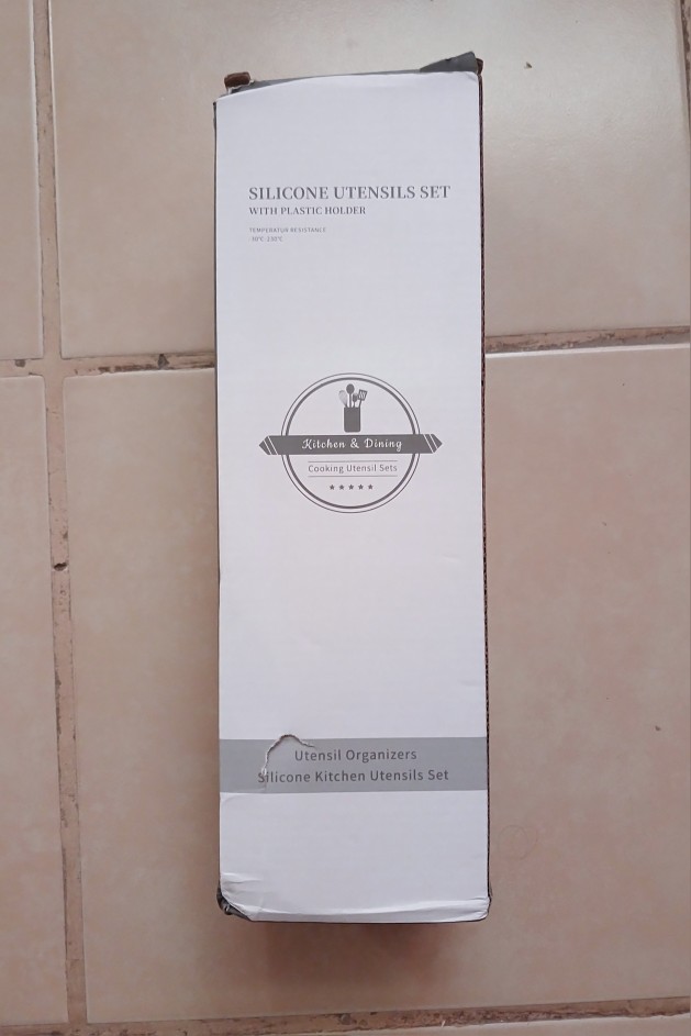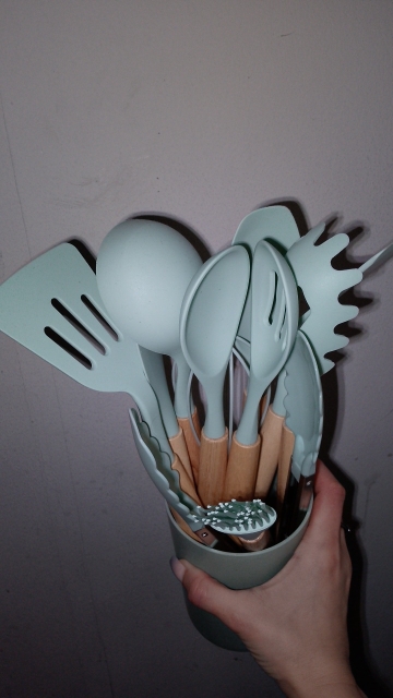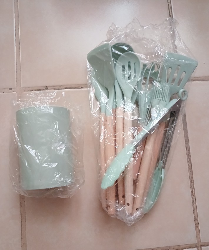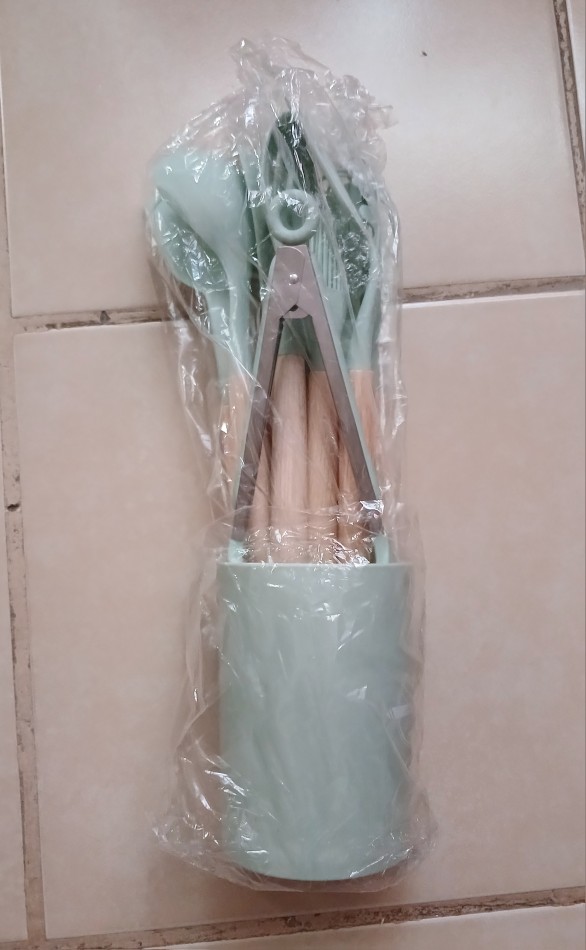 Con razón el juego en color turquesa está mucho más barato que en los demás colores. La caja de cartón viene rota y el vaso plástico contenedor de los utensilios viene desfondada, imposible de arreglar. Pero los utensilios son lindos .