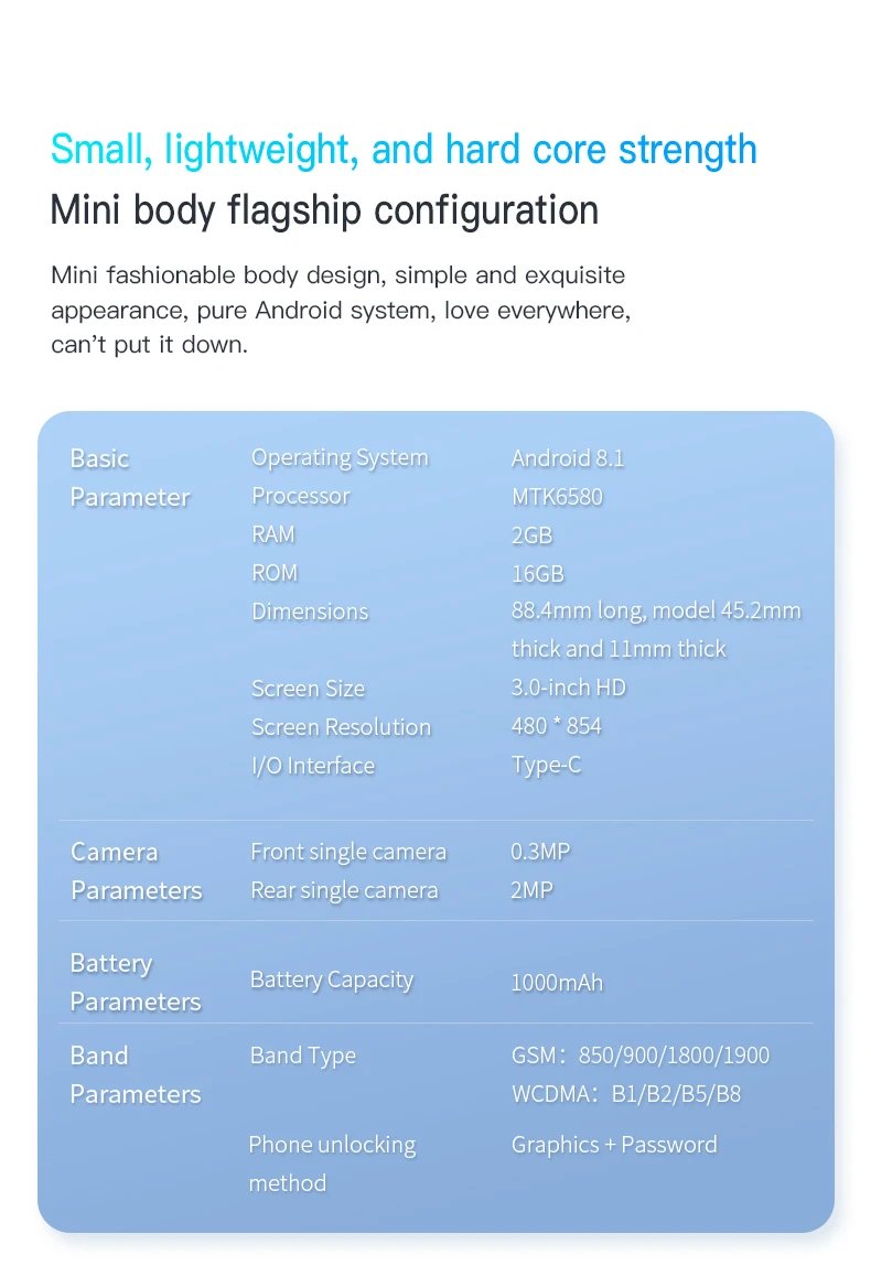 Supports the simultaneous insertion of two SIM cards, Supports 3G WCDMA networks, ensuring a balance between work and life. A small phone can also be of great use.