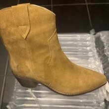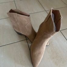 Отличные замшевые казаки очень красивого песочно-коричневого цвета, не рыжие, цвет просто подо все! нормальная стопа с нормальным подъемом, ровно 24 см, косточка на левой ноге и даже с ней 37 размер 23.5 см от производителя свободный, с плотным носком хорошо, думаю, что и меньший размер был бы хорошо, с учётом что это замша и она ещё растянутся, большемерят конкретно!