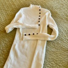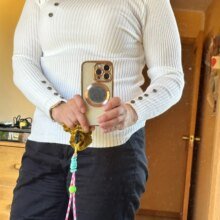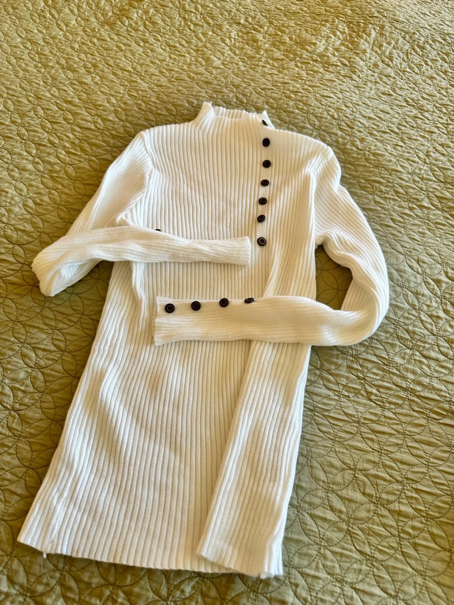 Cute on the model in the pic. Not so cute on me. Cozy, comfy material. Beautiful color. Too fitted for my comfort.