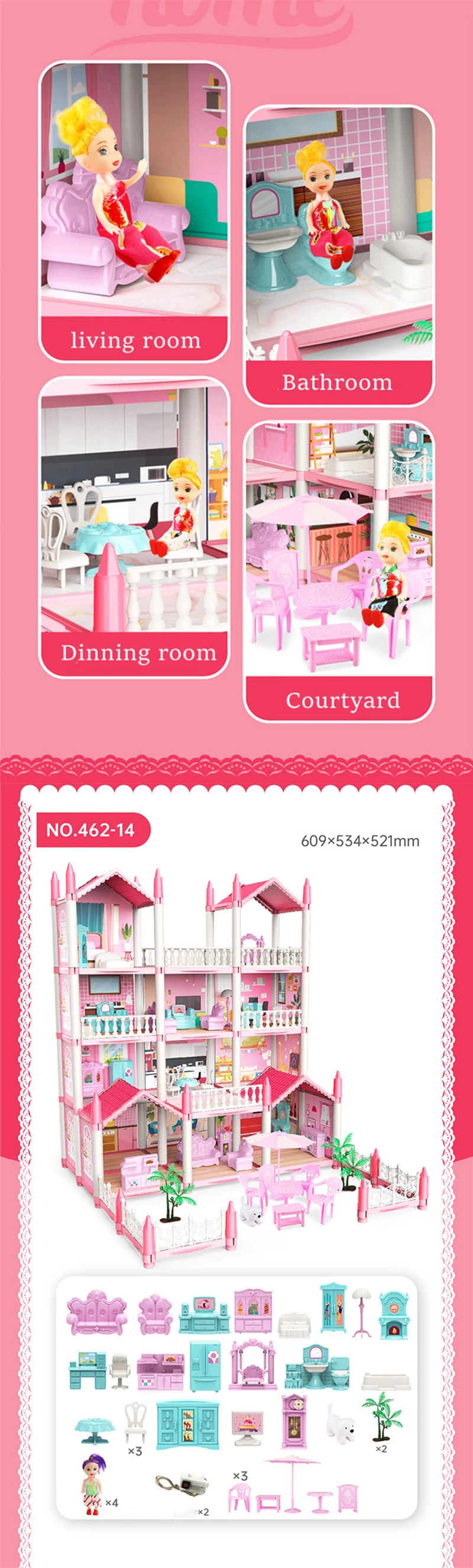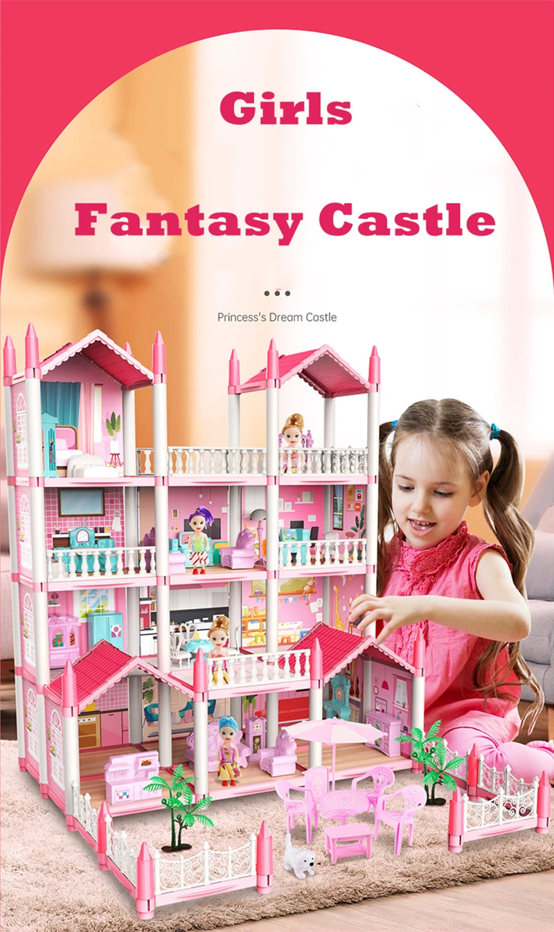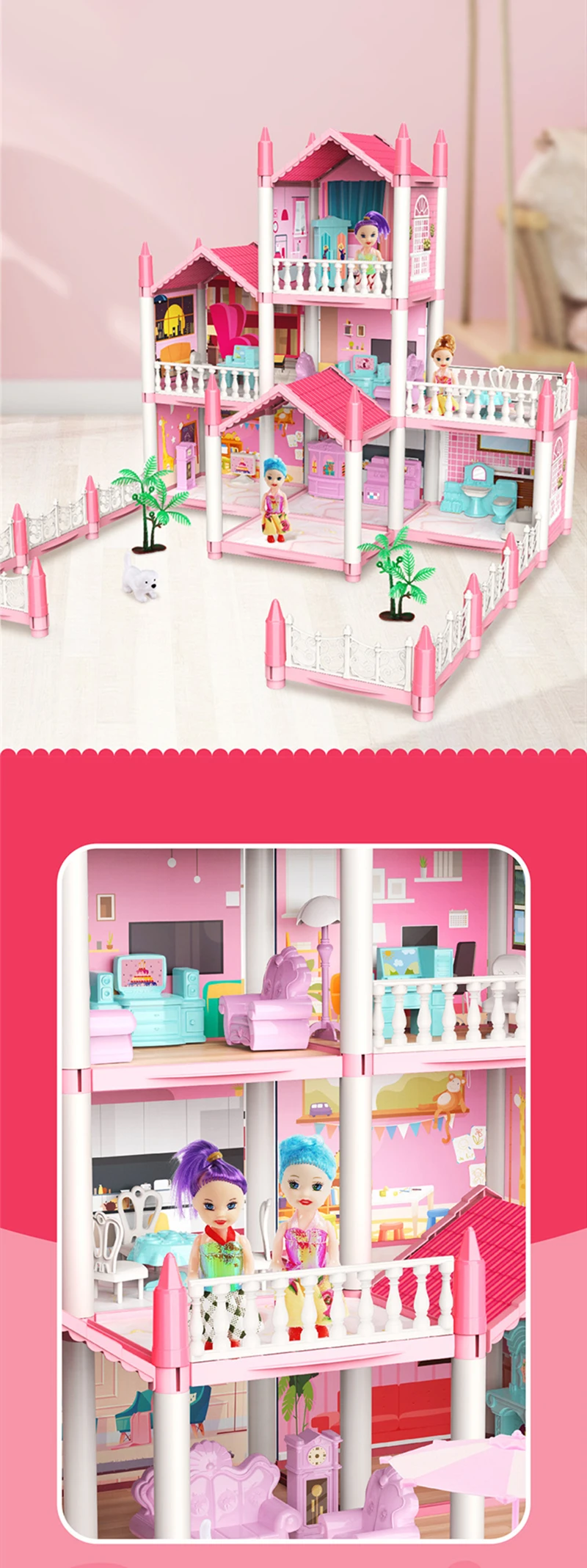 Princess Big Villa DIY Dollhouses Pink Castle Play House With Slide Yard Kit Assembled Doll House Toys for Girls Children Gifts