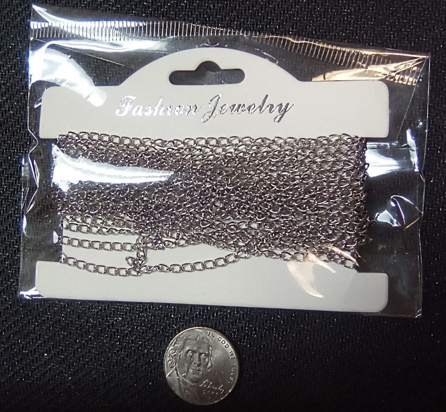 I measured, and the links are 3mm x 2mm. I'm not, however, going to unspool the chain to check the length. I miscalculated, and this chain is too small for the project I had intended to use it on. However, another use will present itself, I'm sure. I always have thousands of project ideas floating around in my brain, but the data retrieval and the memory storage are seldom in sinc on that computer. Hopefully, when the project it will work for comes to mind, my brain will remember that I have it... and where I put it! LOL! Anyway, I'm sure I will find a use for it, and I'm satisfied with this purchase.