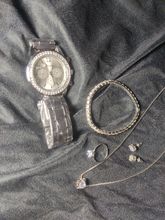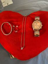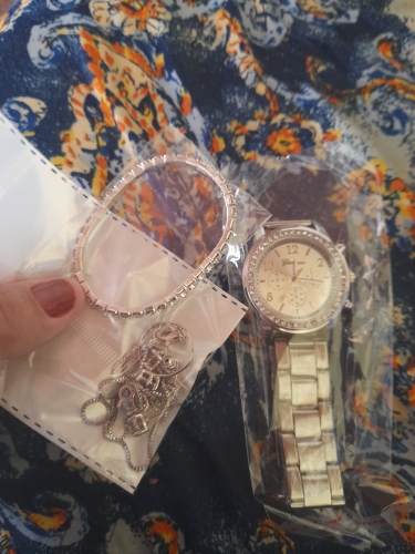 it looks exactly like the picture, and it arrived earlier than expected. The bracelet stretches enough for it to go on your hand, and the ring is adjustable.