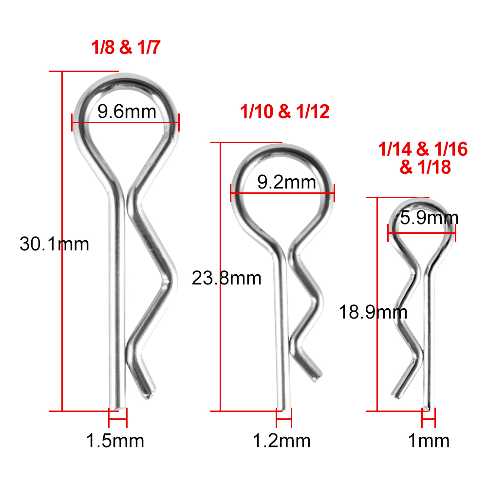 2. Size information: 1/8 & 1/7 R clips is approx. 30.1mm in length, 9.6mm in width; 1/10 & 1/12 R clips is approx. 23.8mm in length, 9.2mm in width; 1/14 & 1/16 & 1/18 R clips is approx. 18.9mm in length, 5.9mm in width; please check size information before purchasing.