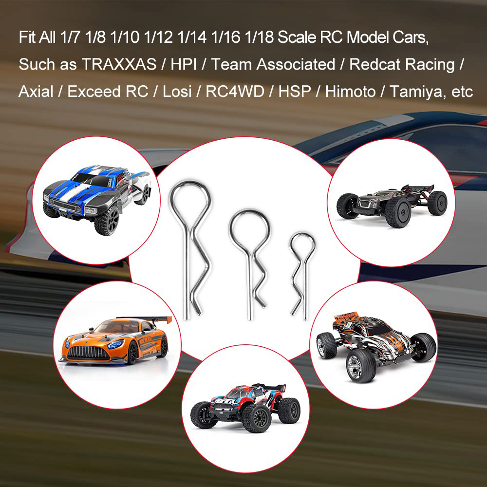 50/100-Pack pins, great replacement clips for RC car fans. Bend designed, offer easier removal than standard clips. Wide application, Universal clips for 1/7 1/8 1/10 1/12 1/14 1/16 1/18 Scale RC Vehicles. Great for body shell posts, wings, battery holders.