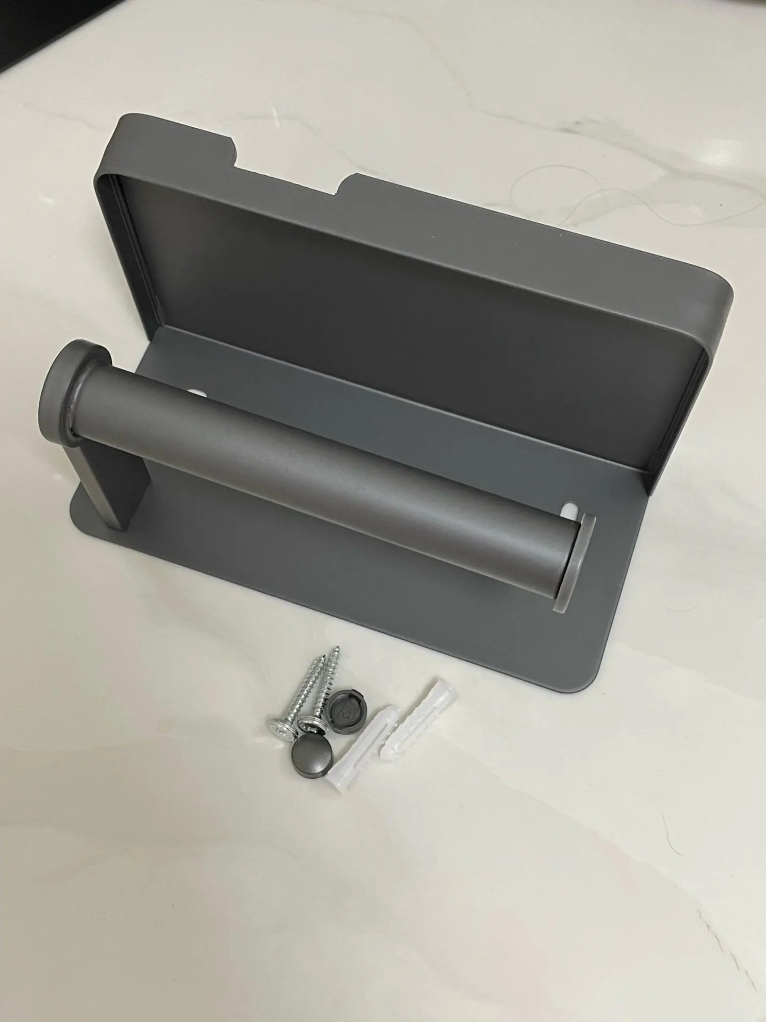 Great item. It comes with screws and caps so you will not see tops of these screws. It has space just to put there air freshener and small decoration - it is not big to put there box of wet wipes (at least not that big one). It is made from aluminium or some other kind of metal. Anyway i really like this toilet paper holder. Oh and it was good packed, so it came to me without any defect.