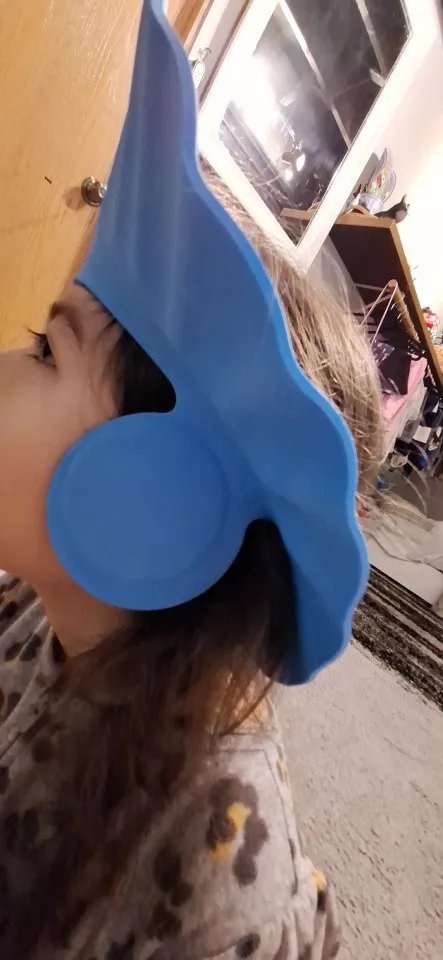 Has adjustable sizing which is great. If you have a baby I would start using this during bath time to avoid them getting soap in their eyes.