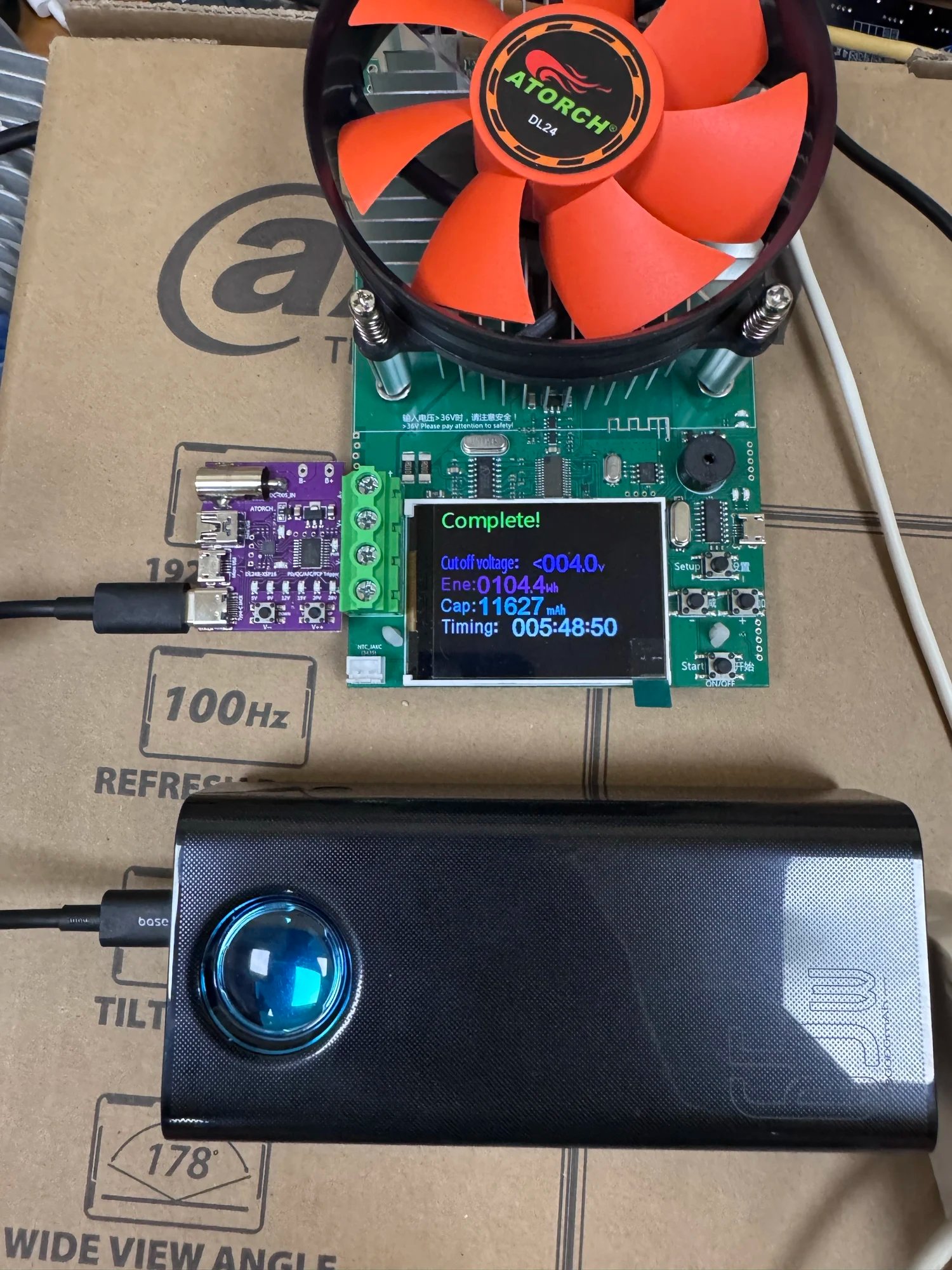 Пришел заряженный на 82%, быстрее срока. Заряжает телефоны Xiaomi Mi Max 3, Redmi 14C и ноутбук Honor Magic book быстрой зарядкой. Сам тоже заряжается быстрой зарядкой от зарядки Anker 65W. Все отлично.