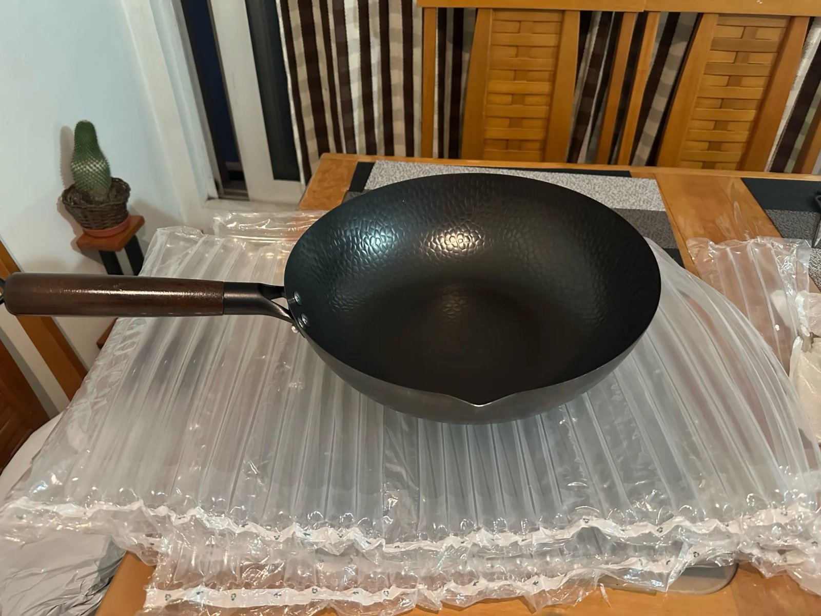 I received in good shape. The pan looks nice. It is plain steel, without the poison nonstick, just like I prefer. The handle is also easy to remove to save space or for remove before use in oven. I recommend this pan :)