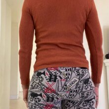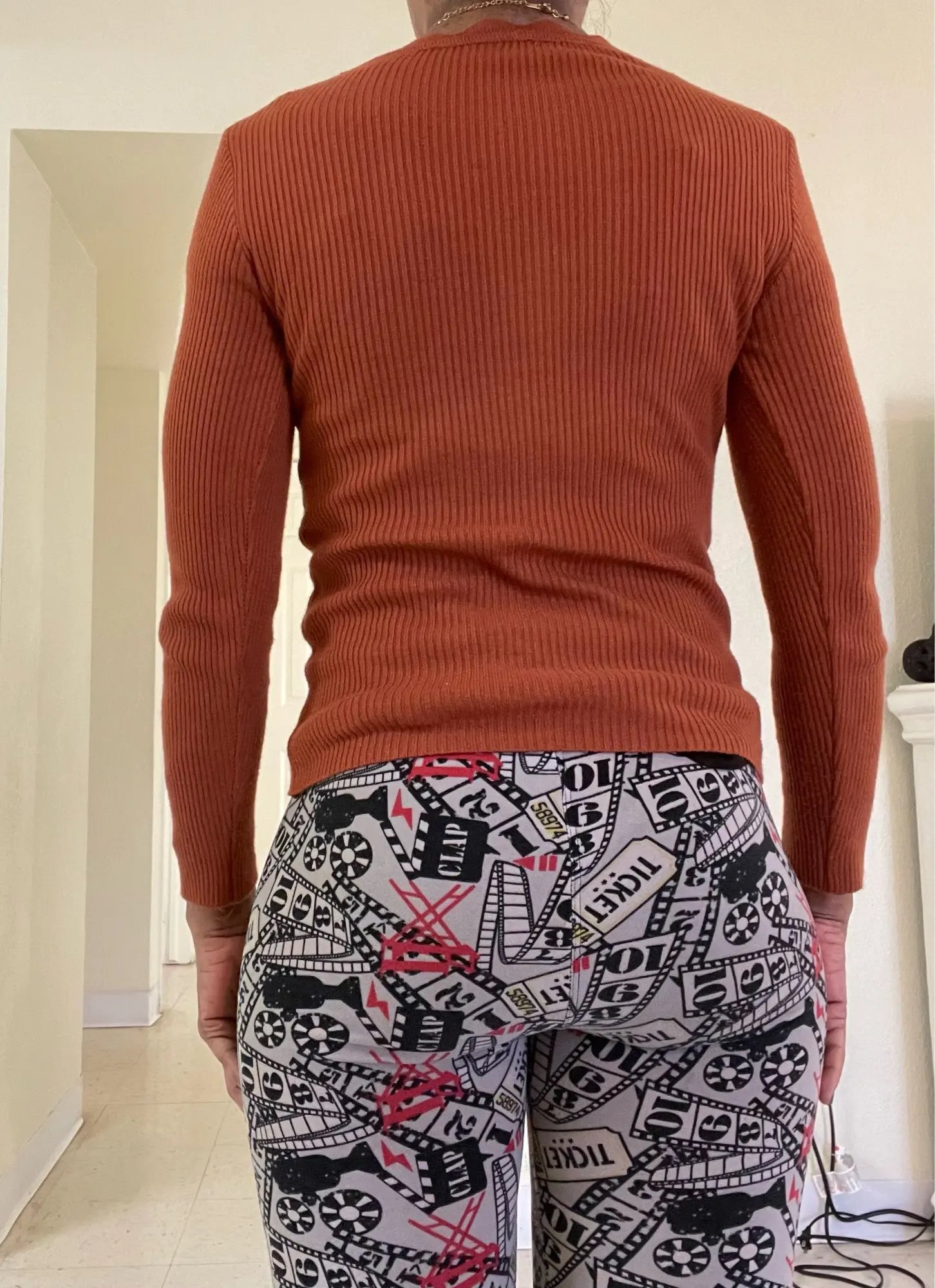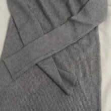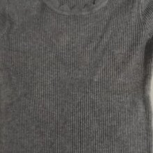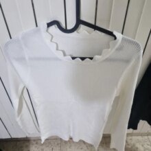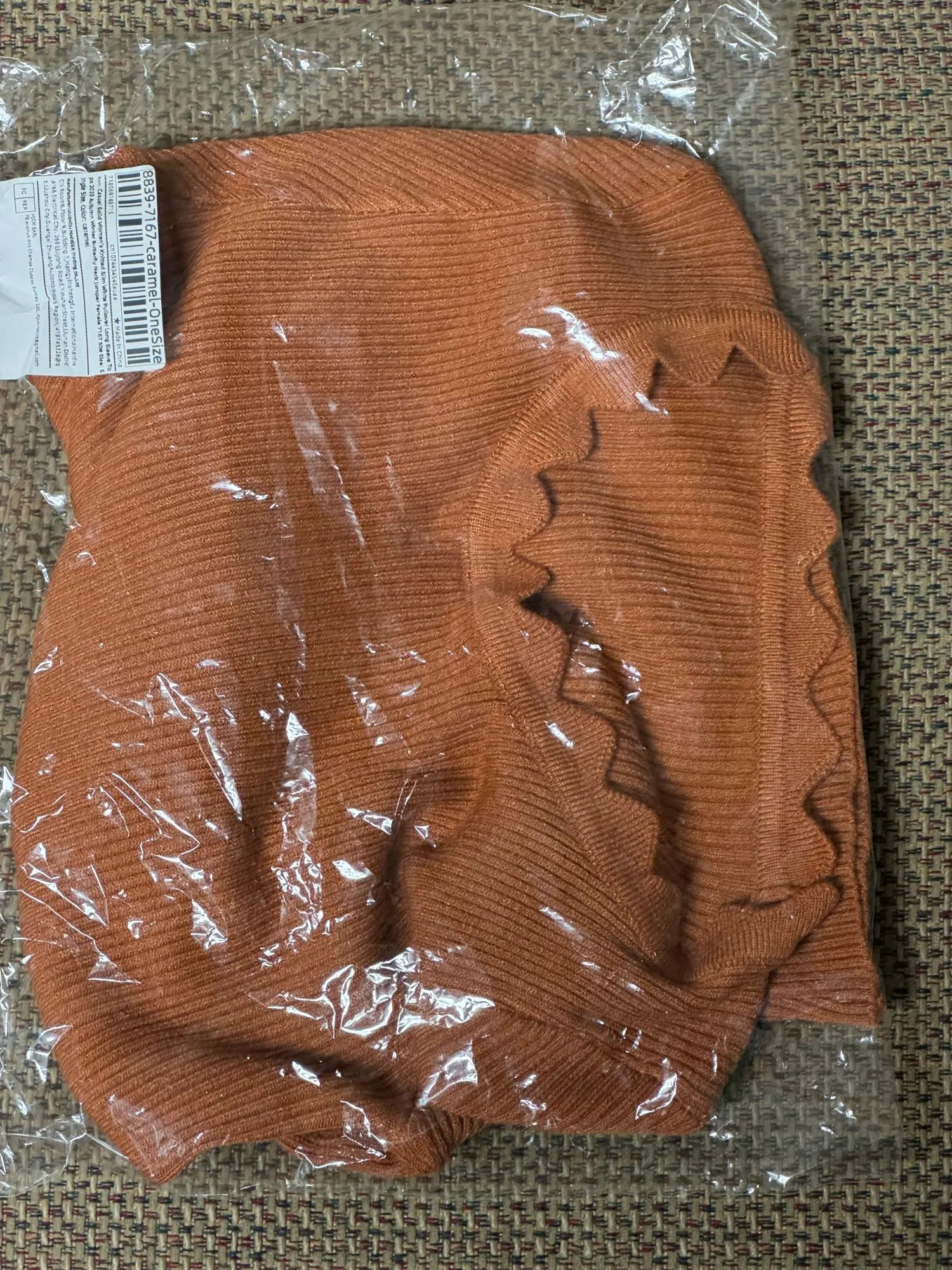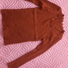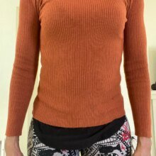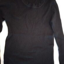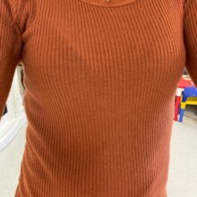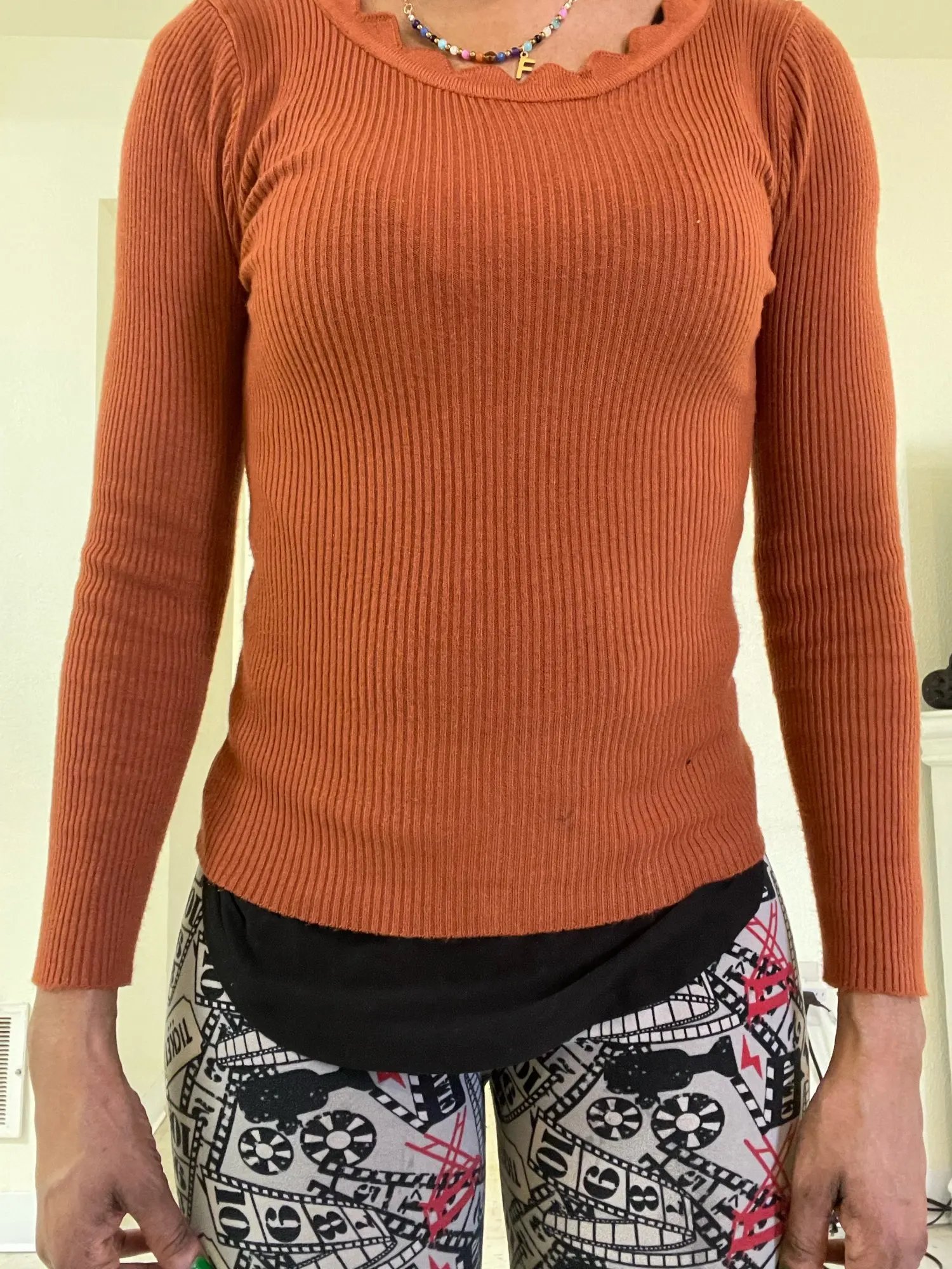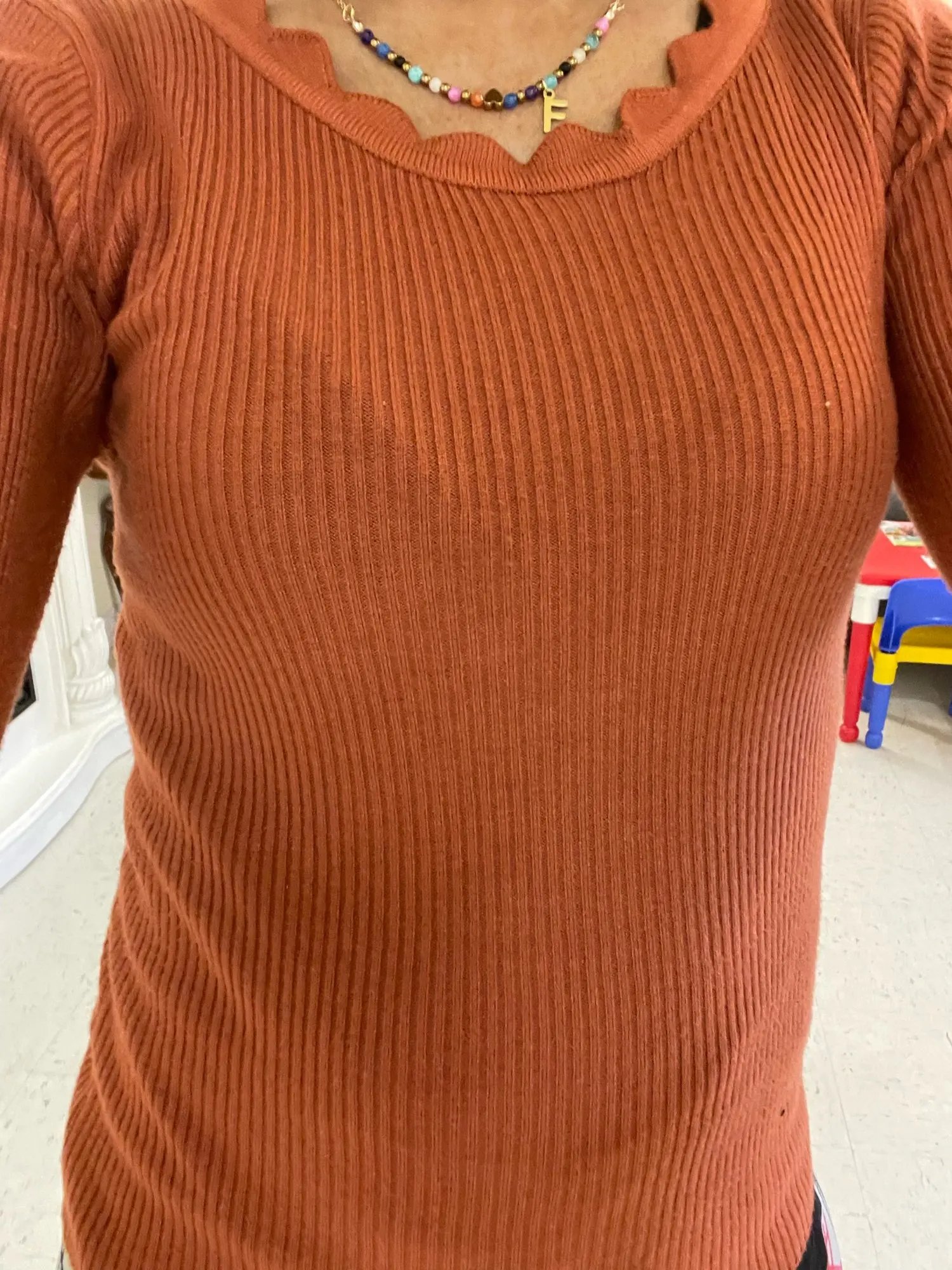 Dark brown sweater with a nice scalloped neckline. The material both looks and feels good. Fits well