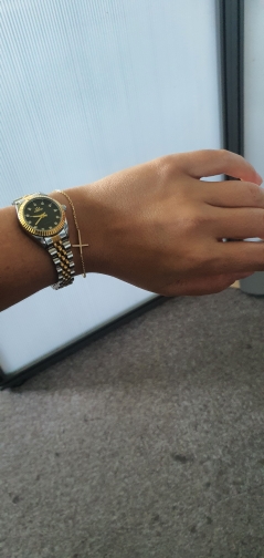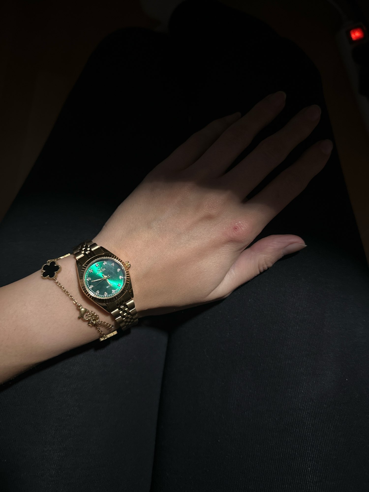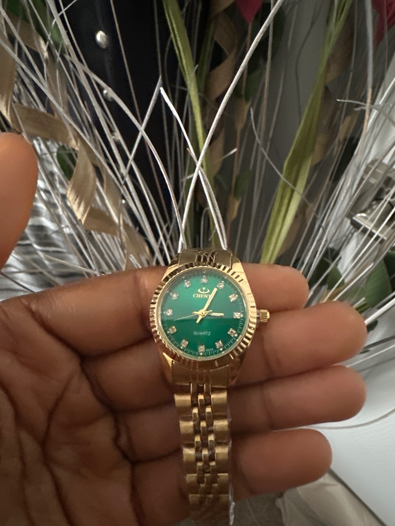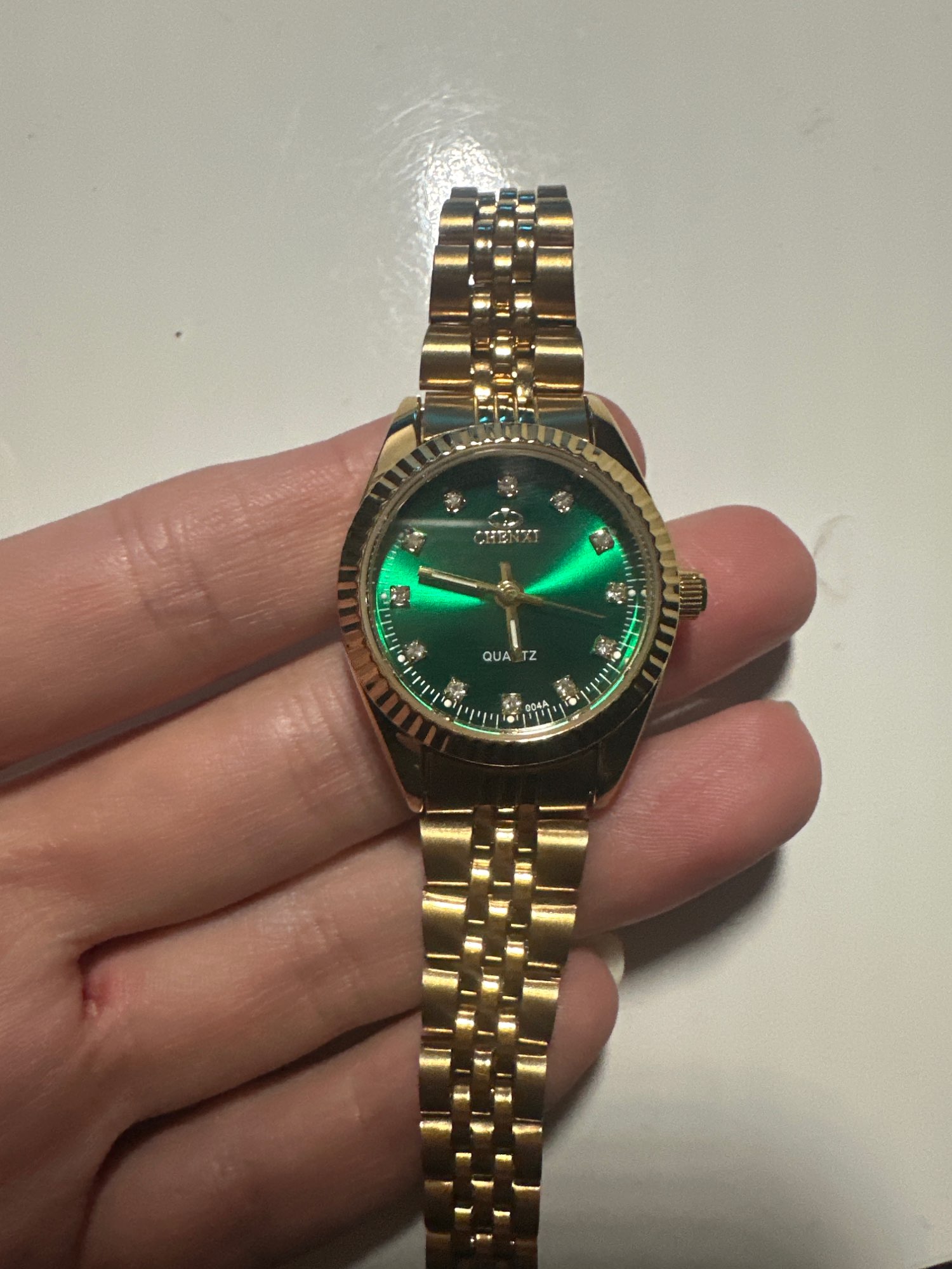 Perfect colors, i have a little darker color of my skin so it compliments very much with the green. Perfect gold. And perfect for small wrist. Need to adjust to profesional