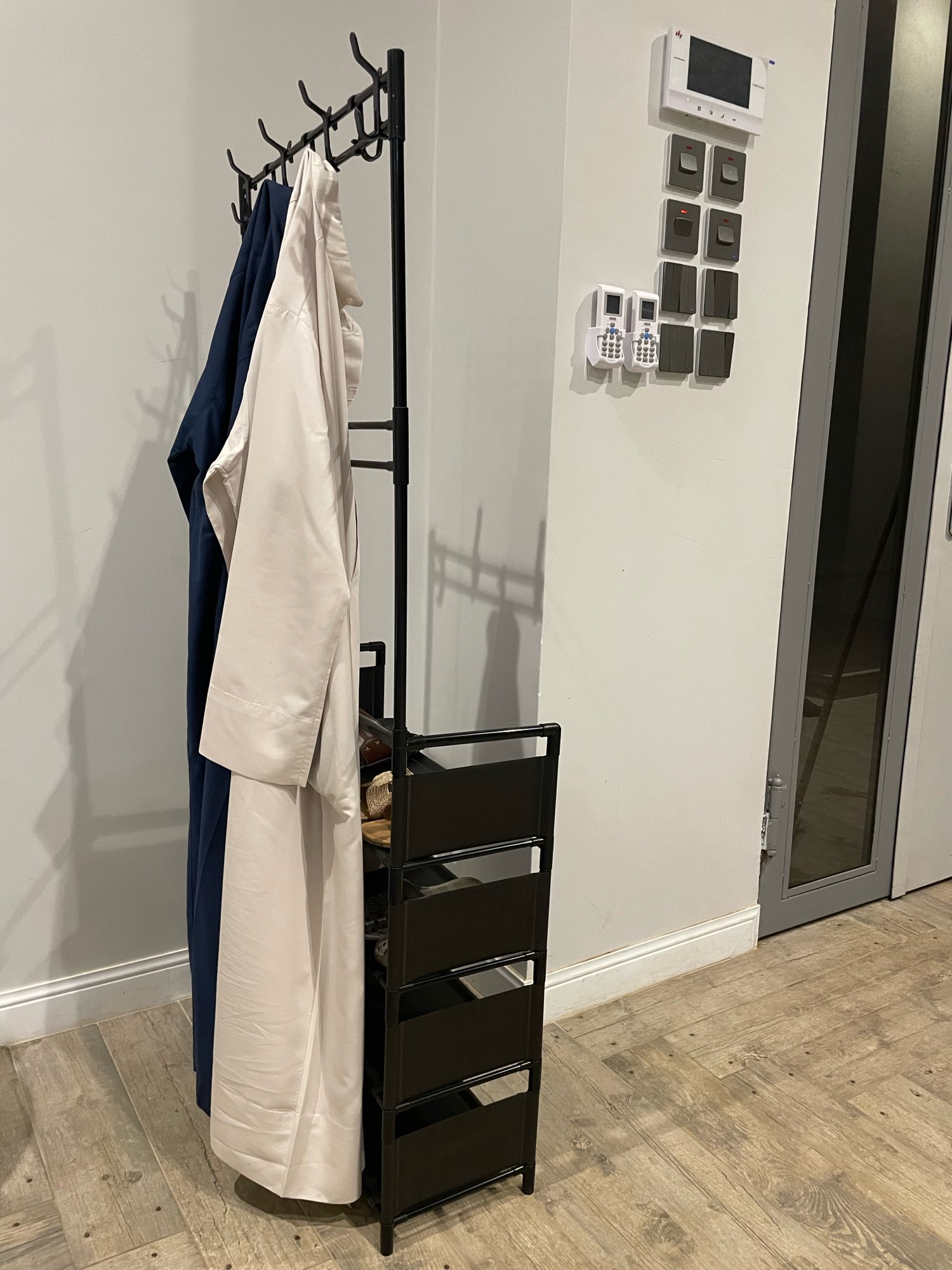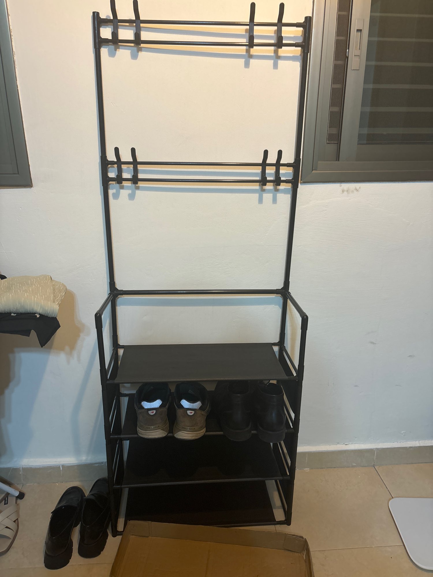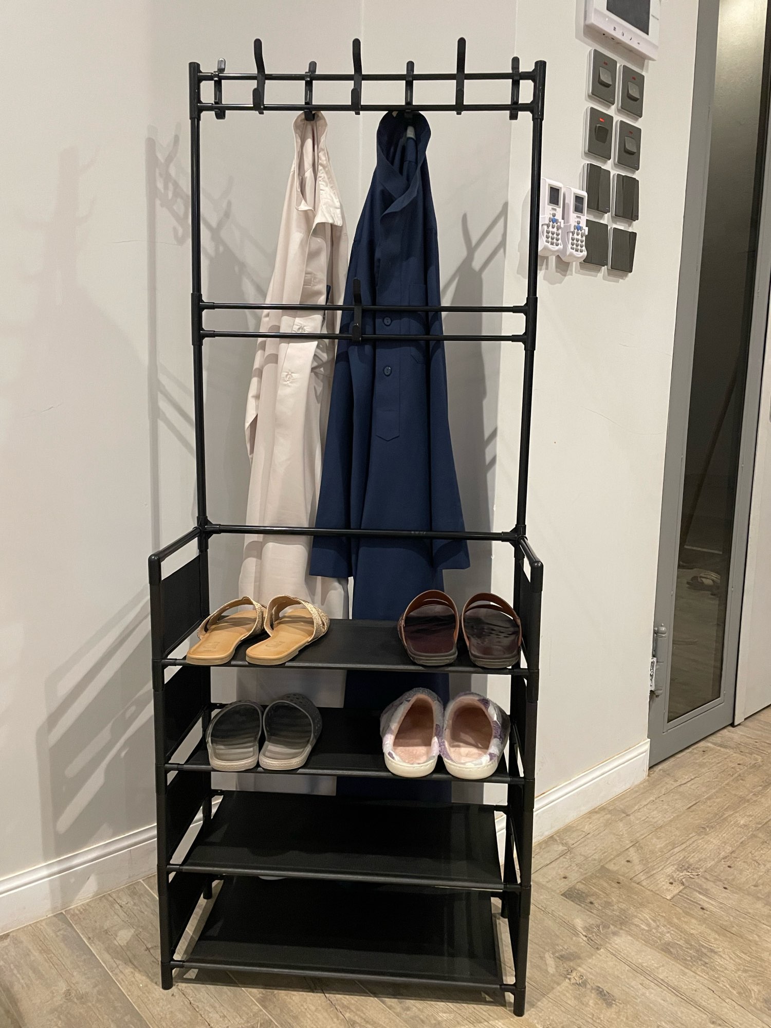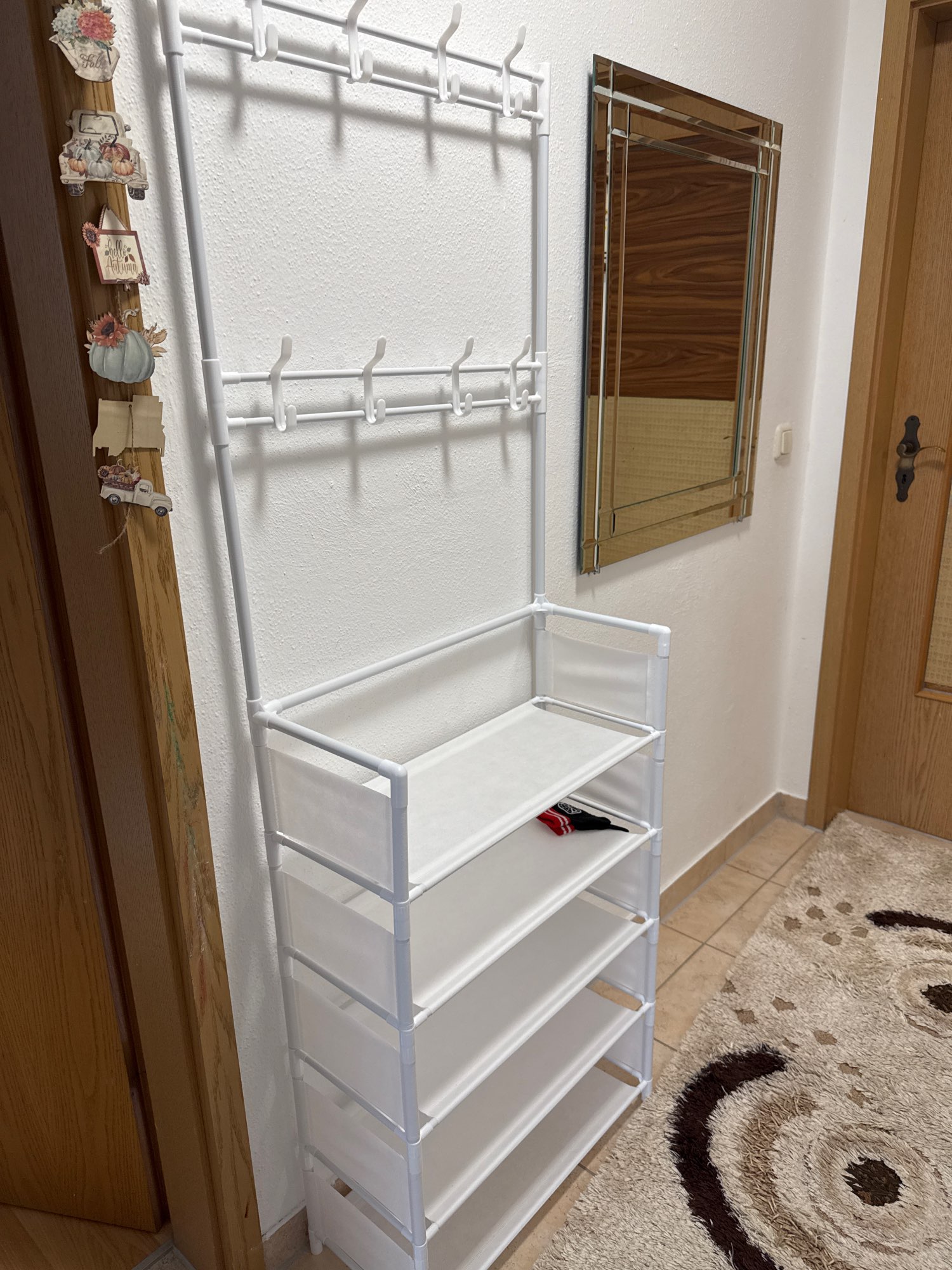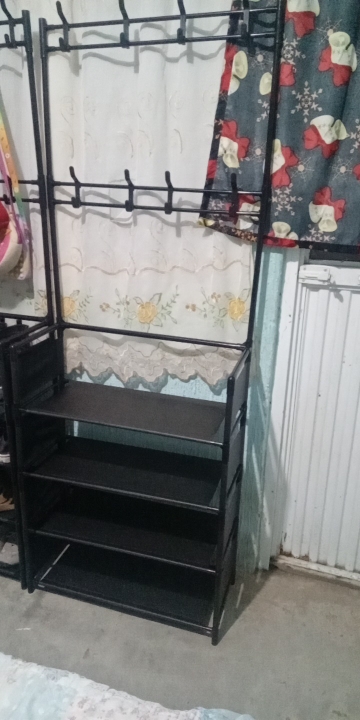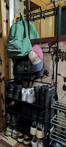 Подяка під взуття дуже сподобалася, тим паче брала за монети вийшла гарна знижка,самі полки з матерії,але вона гарно витирається.