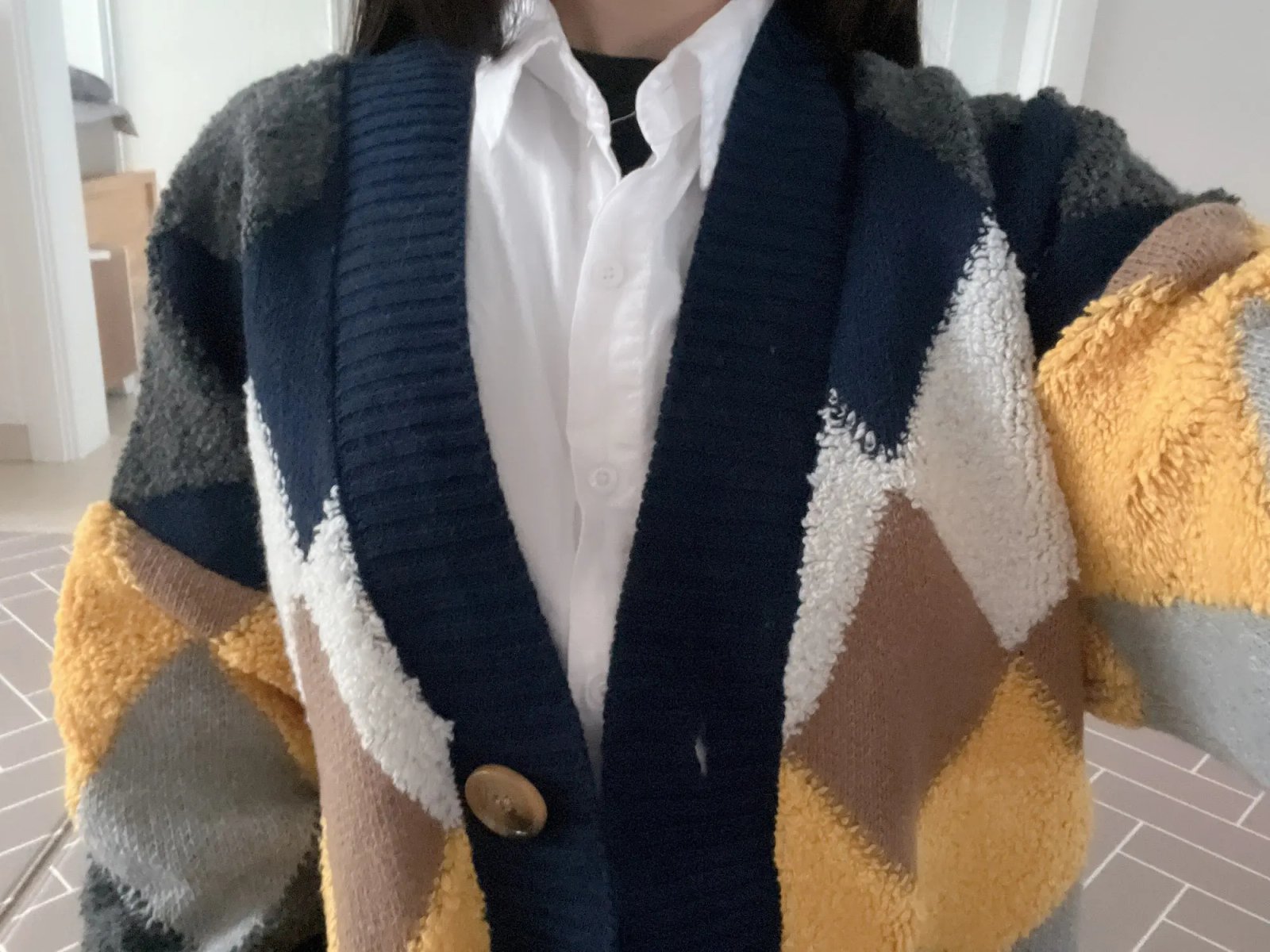This cardigan is one of the best things I've purchased from AliExpress. It is oversized and I love it. I am a UK size 10 and I love the fit. The material is lovely and it doesn't smell. Awesome cardigan!