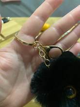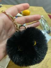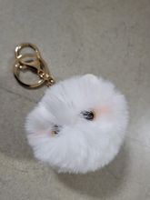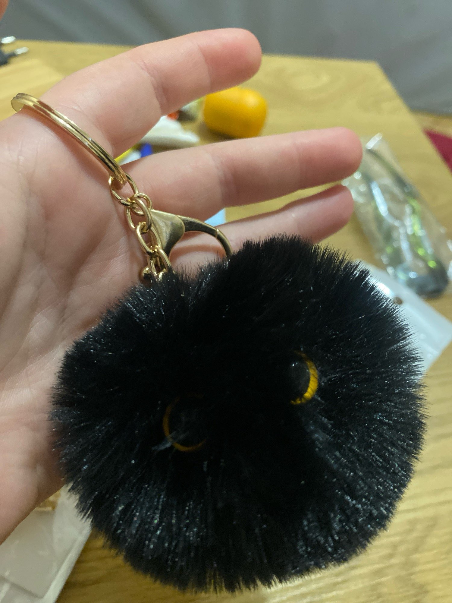 very soft and fluffy. eyes are very hidden in the fluff but it's still cute. comes with both a clip and loop ring