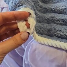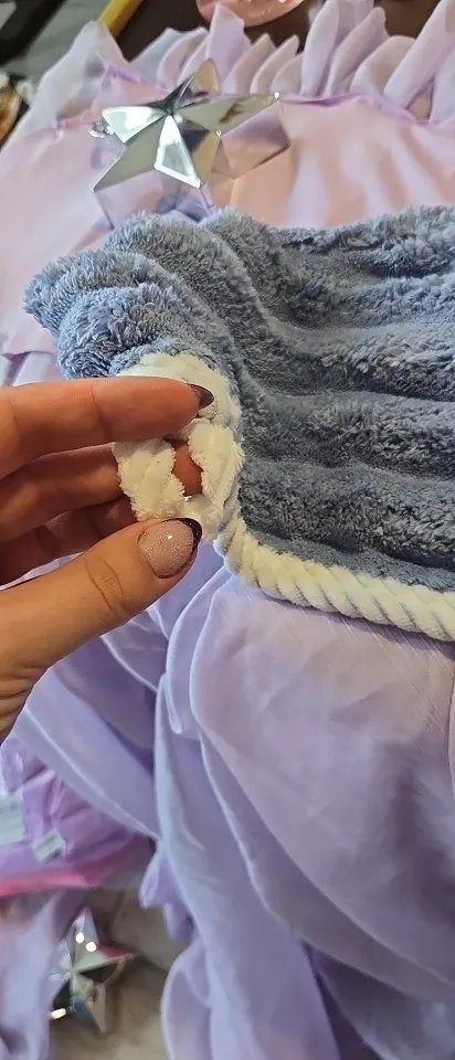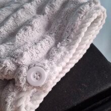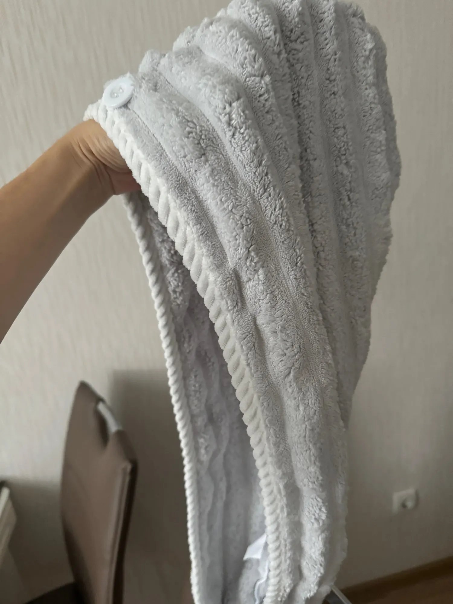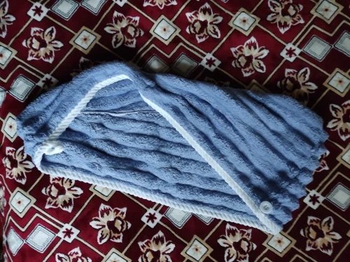Дійсно нормально поглинає вологу, перед першим використанням випрала його, щоб точно добре поглинав, бо на дотик був не дуже приємним, синтетичним. Але як виявилось зі своєю задачею справляється добре і доволі обʼємний, отже має бути зручним для густого і довгого волосся. З мінусів можна відмітити петельку, вона з тканини, а не з резинки, тому трохи важко застібувати її на ґудзик)