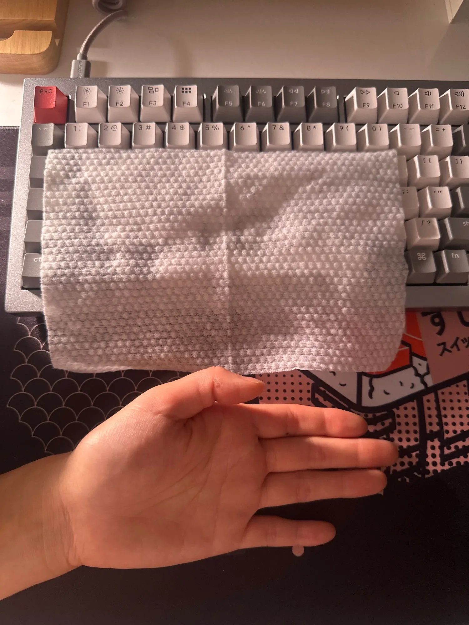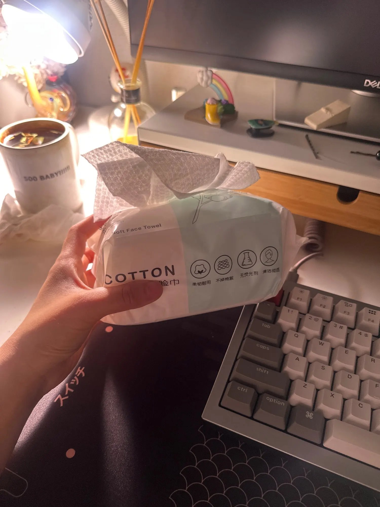 Great packet of dry, plain soft cotton tissues. I wet them with water to clean my desk. Solid packet of tissues that can last a while. Product is as advertised. No offensive smells. Clean and nicely packaged.