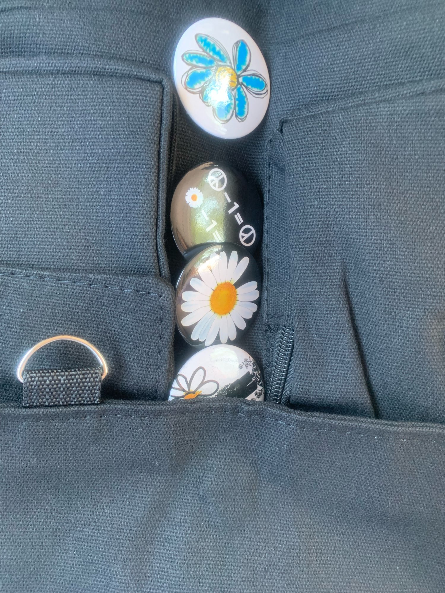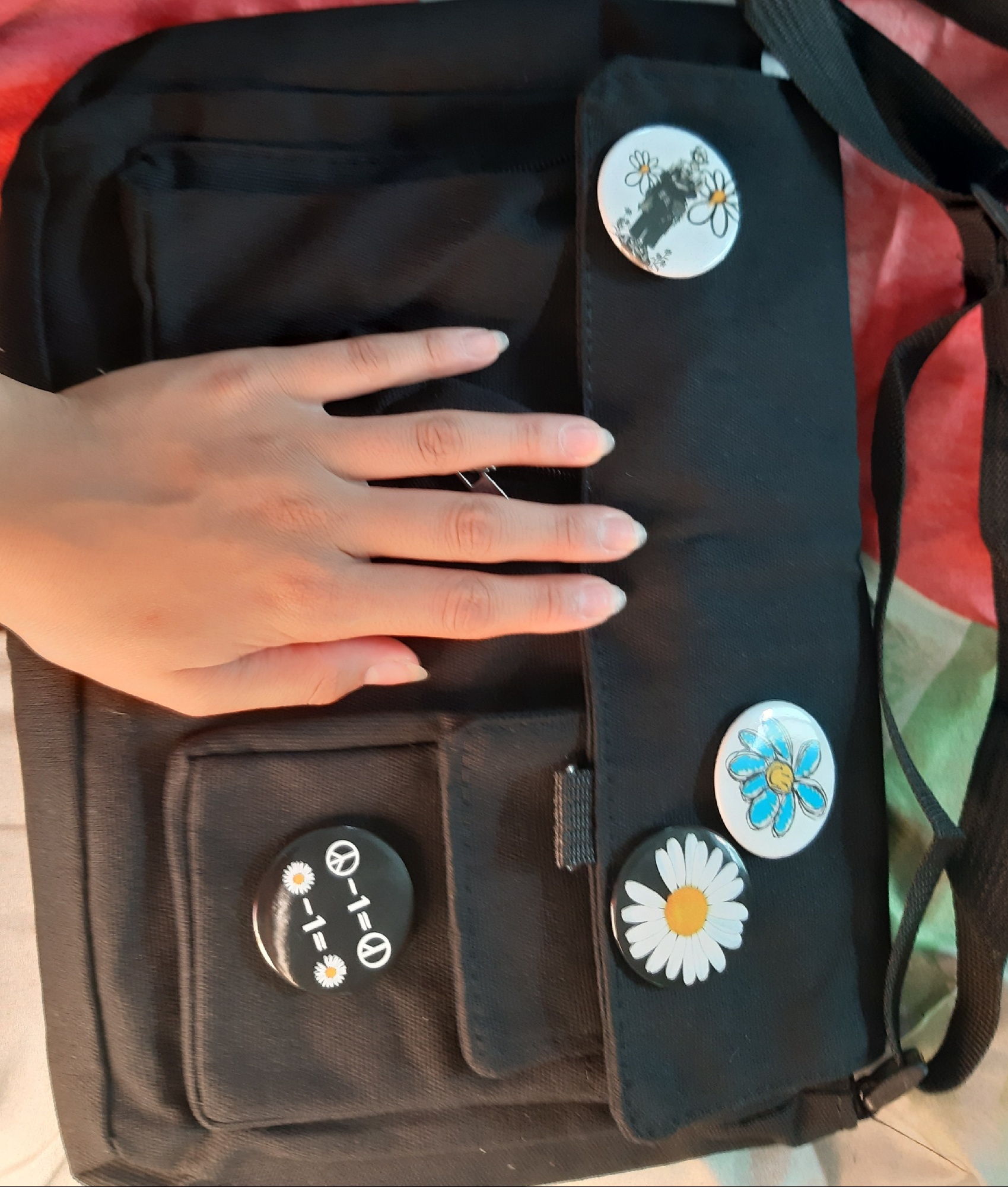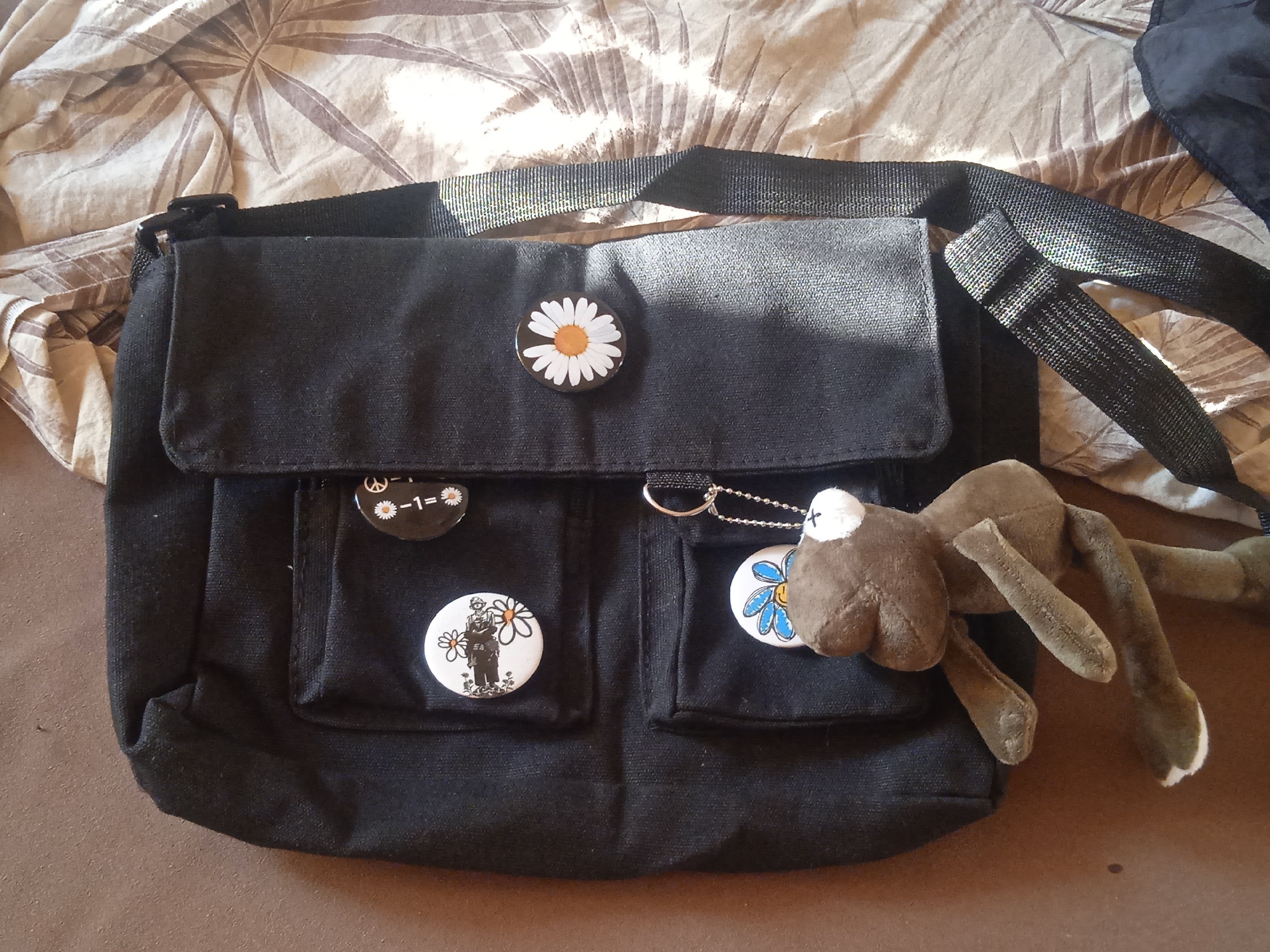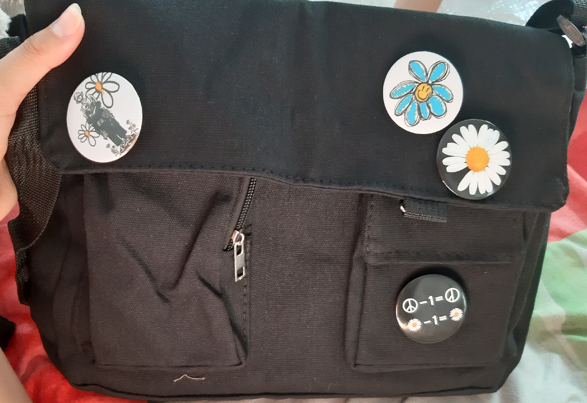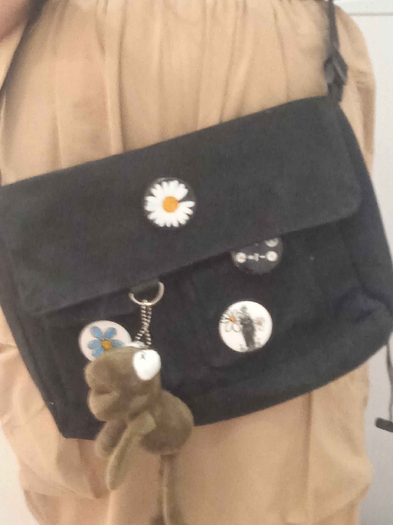 Very cute handbag! Large and roomy! The strap can be adjusted, so you can hang over your shoulder! Very comfortable and high quality. Olin pocket with Velcro, the second on the lock. The bag itself closes with a strong good magnet, nothing will fall out. There were four different flower badges in the set. Very nice!♡The needles are sharp, good! Thank you very much! (Badges with Toad and lavjoy from other order)
