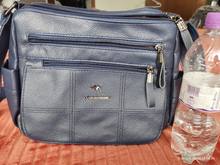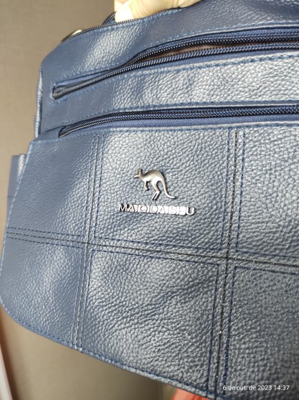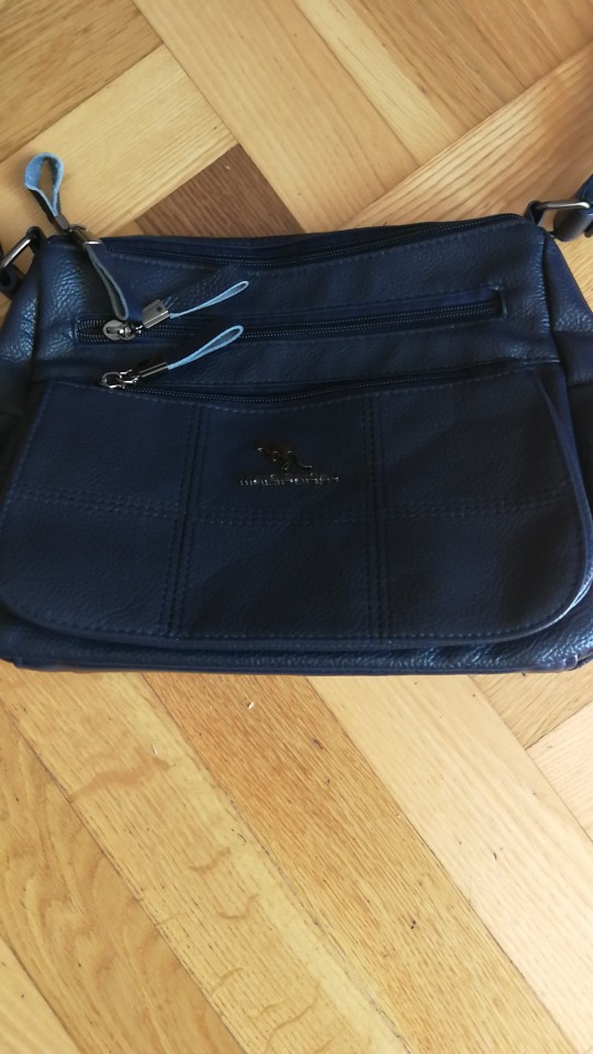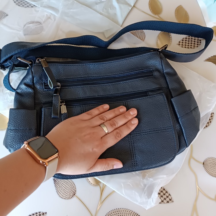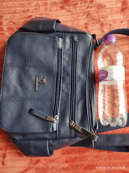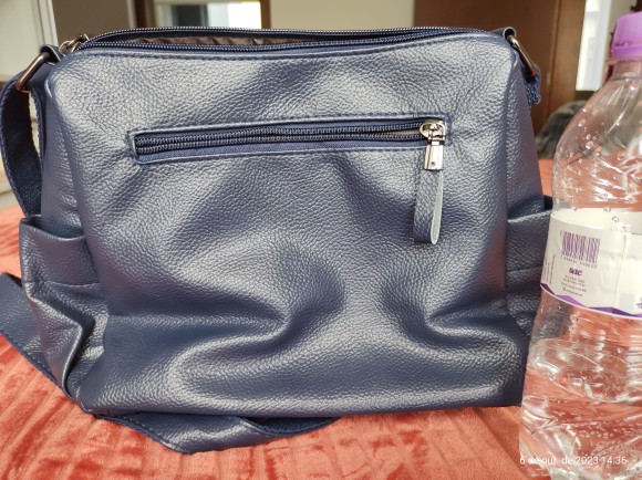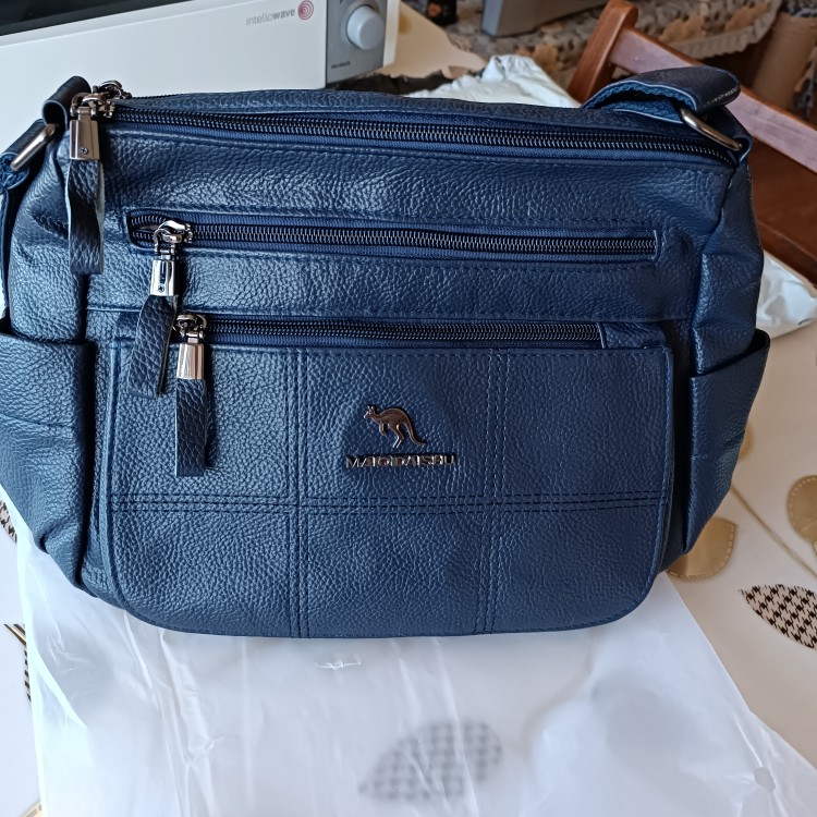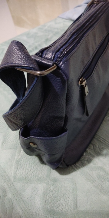 Nice bag in blue. It has many compartments with sliders. Practical and functional.