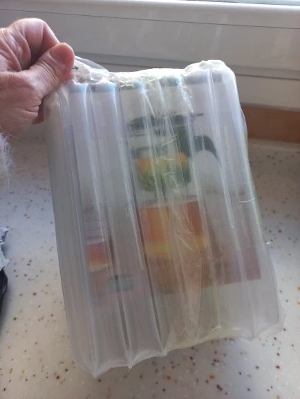 Como se ve en las fotos, llegó perfectamente protegido y es muy práctico. Tiene giro en la tapa de abierto/cerrado, trae instrucciones con fotos y aunque el texto no es español se entiende perfectamente. Lo he probado y funciona. Muy contenta con el artículo y el vendedor.