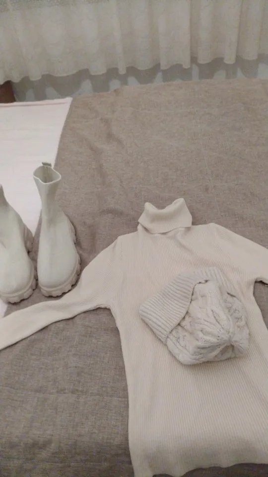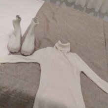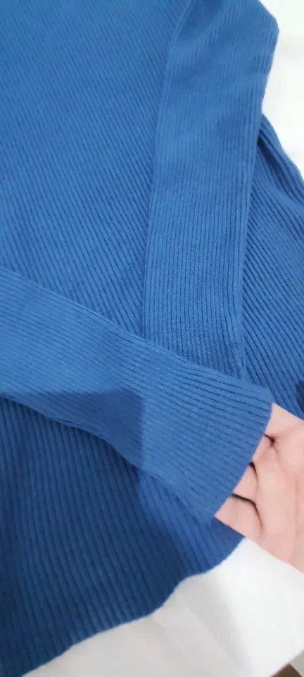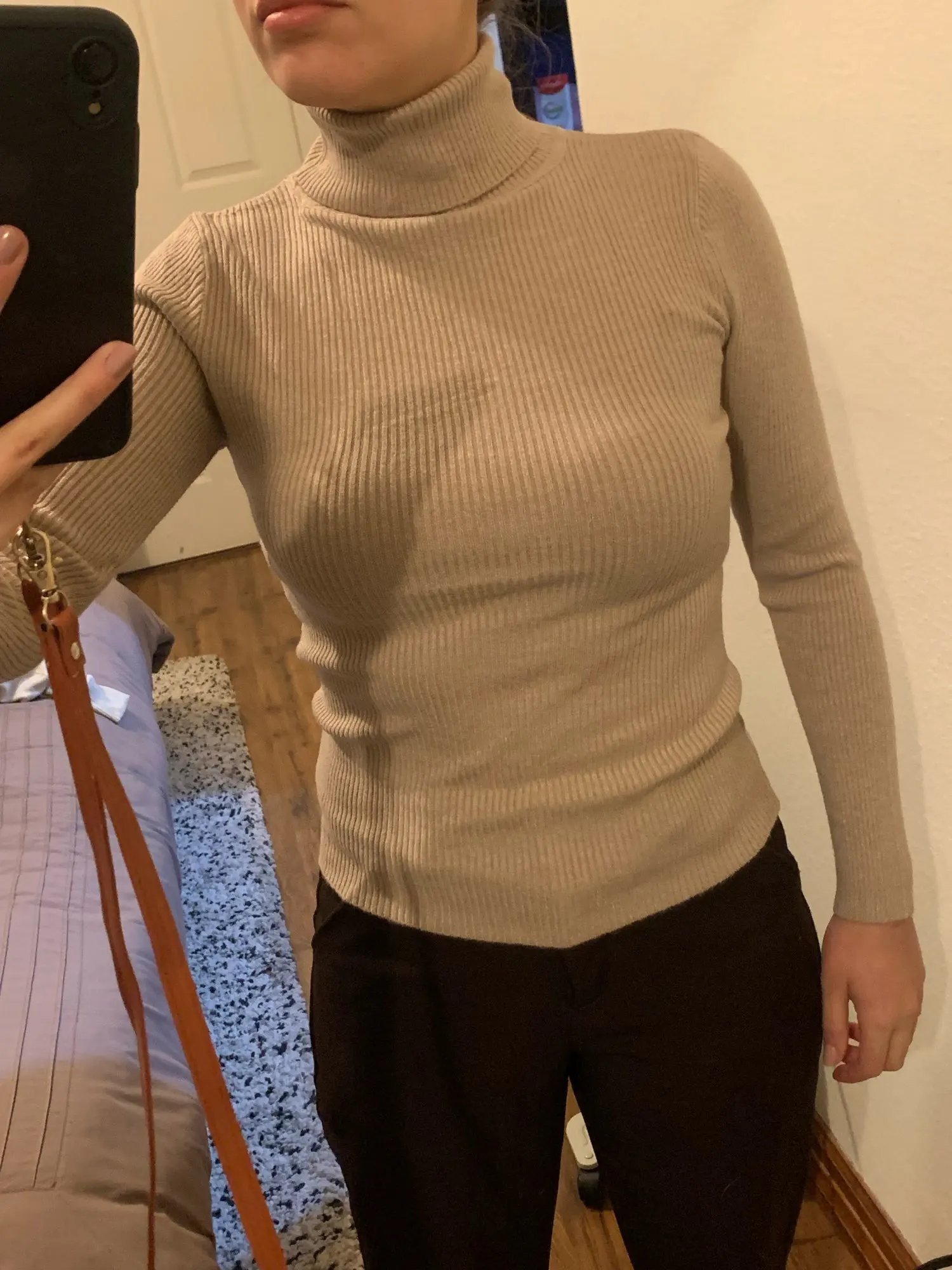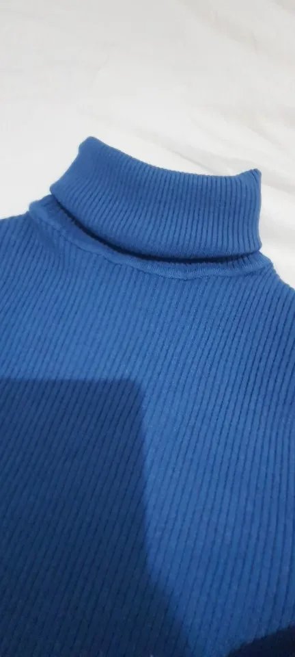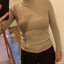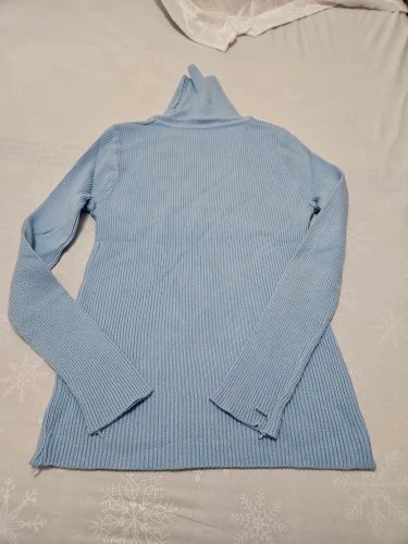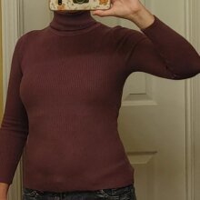 very impressed with this navy turtleneck sweater! it was only available in One Size. At 125lbs, 34/36C it fits great. very Soft and stretchy. the neck is soft and not constricting. arm length fine. it does fall right at my pants waist so if i bend over it will ride up. i wear a longer tank top underneath. i will order in more colors!! thank you