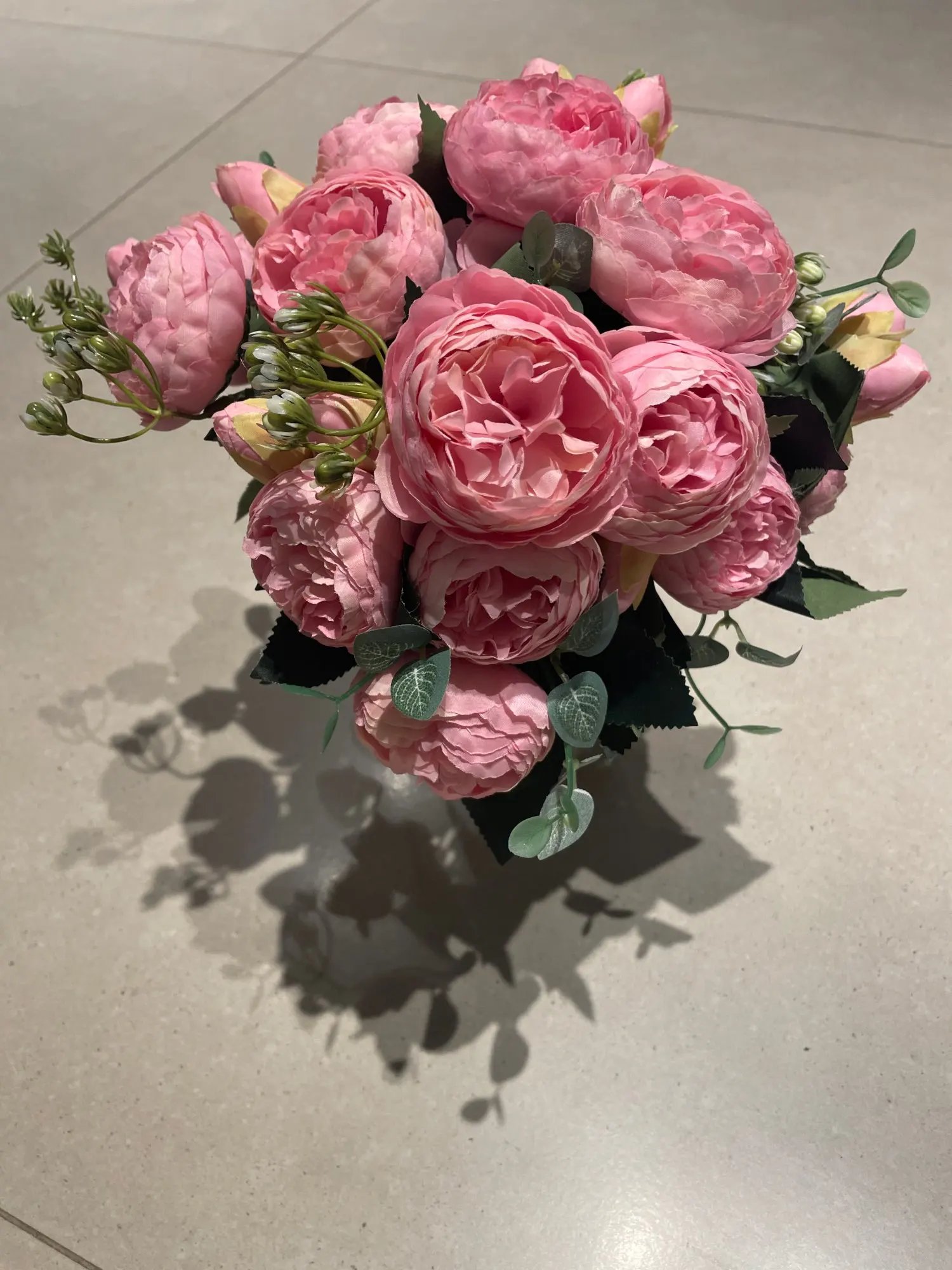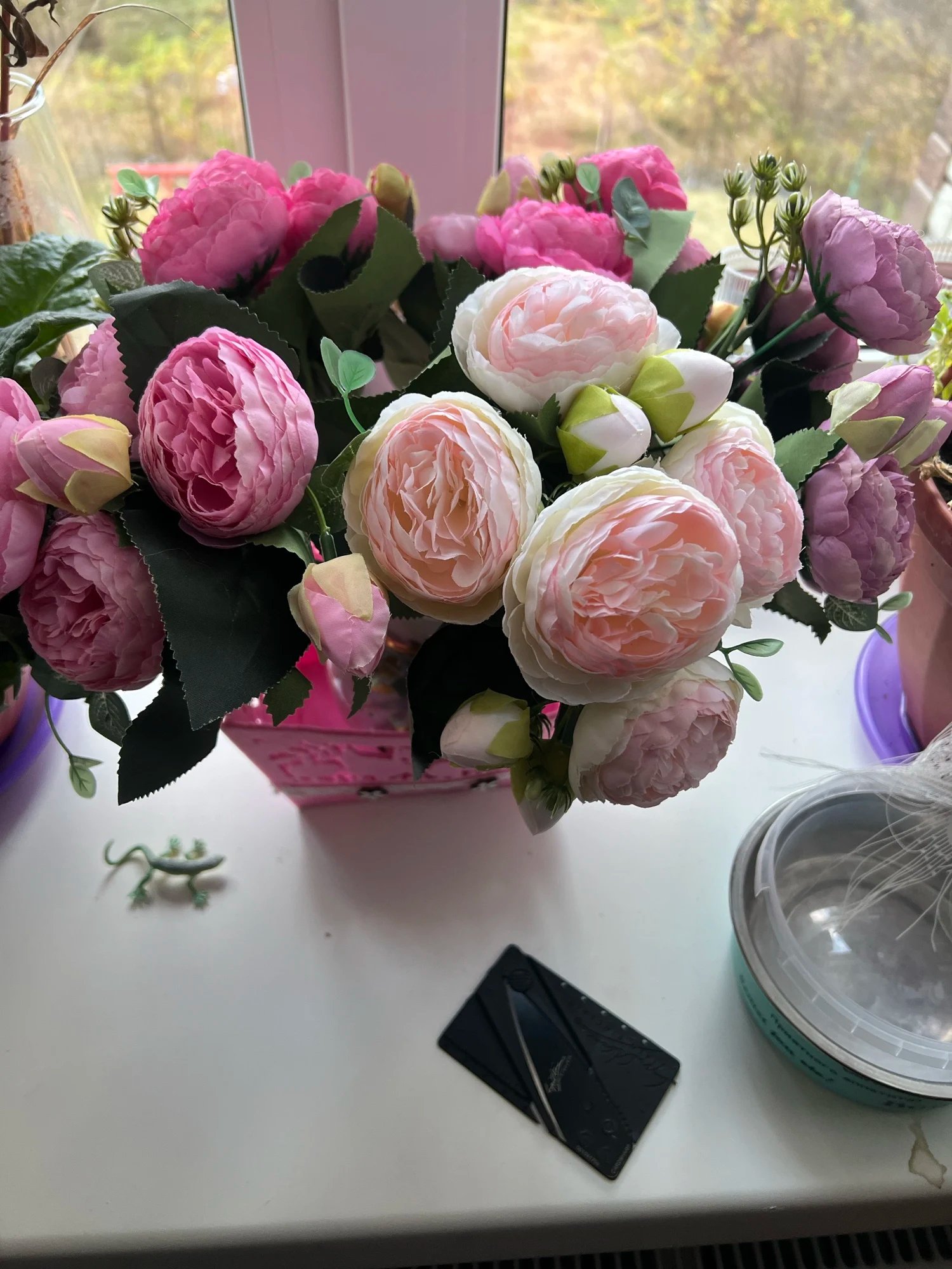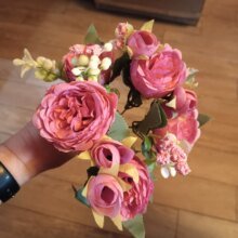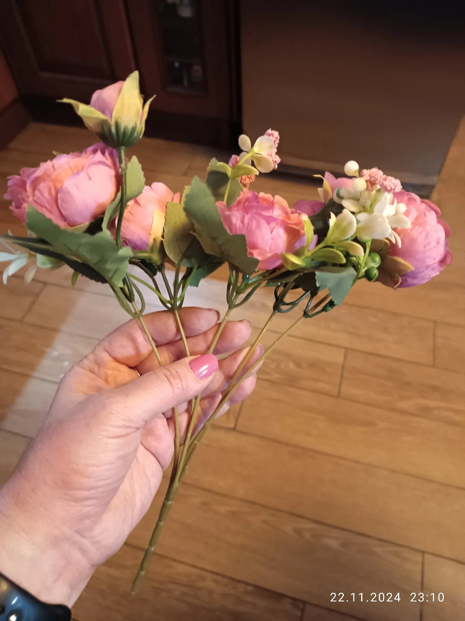 прекрасный букет. цветы кажутся настоящими. надо пароутюгом разгладить листочки и подобрать вазочку. цветы не имееют запаха пластмассы. всем советую. доставка быстрая. спасибо продавцу и удачи