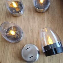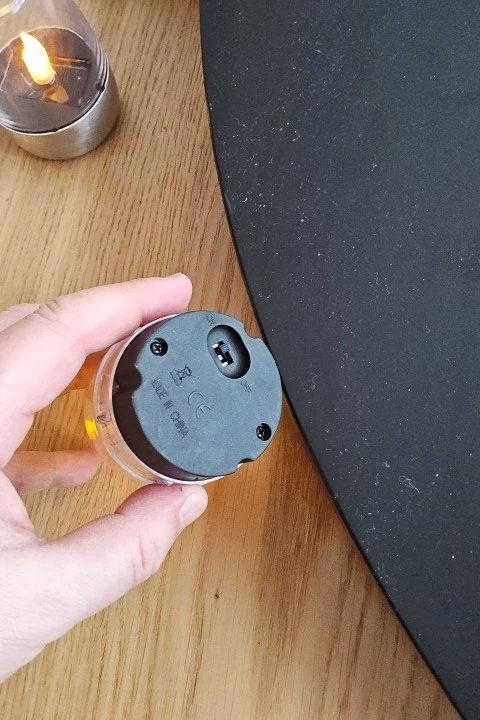 Simple LED flickering. With only 1.5V the better LED candle can not be used. ON-OFF is under the stainless bottom