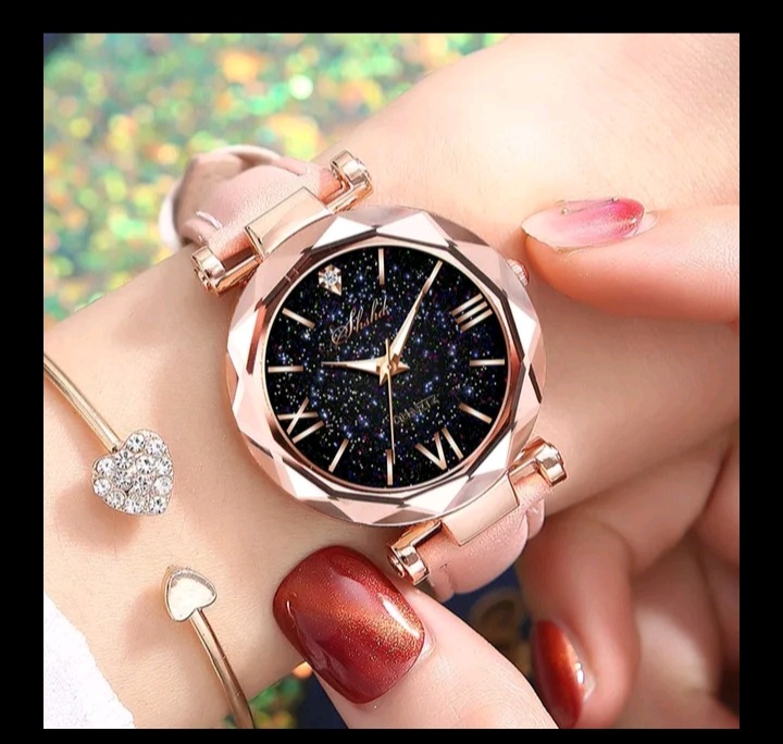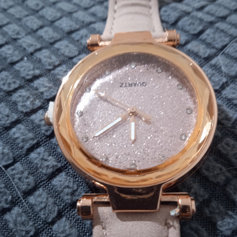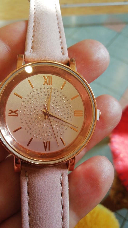 The watch is light. The strap is of poor quality. The clock itself in the inside with pebbles.