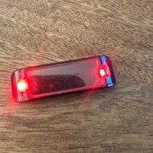 mini led solar de advertencia con dos luces parpadeantes en color rojo, especialmente indicada para colocar en retrovisor interior, mediante adhesivo incluido