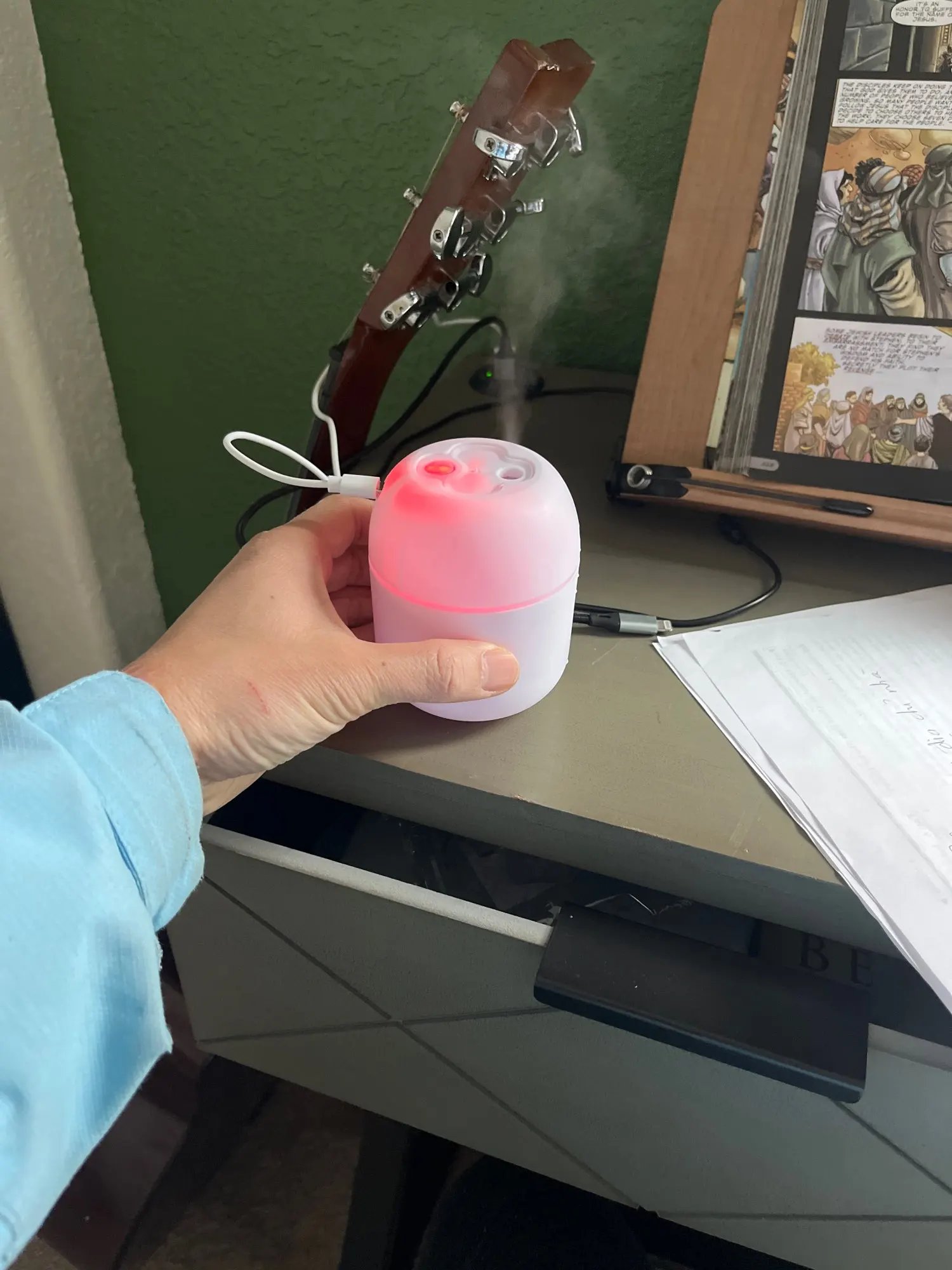 Компактний невеликий зволожувач повітря з підсвіткою, все як в описі, має 2 режими: постійне зволоження та з періодичністю 30 секунд. Працює від юсб.