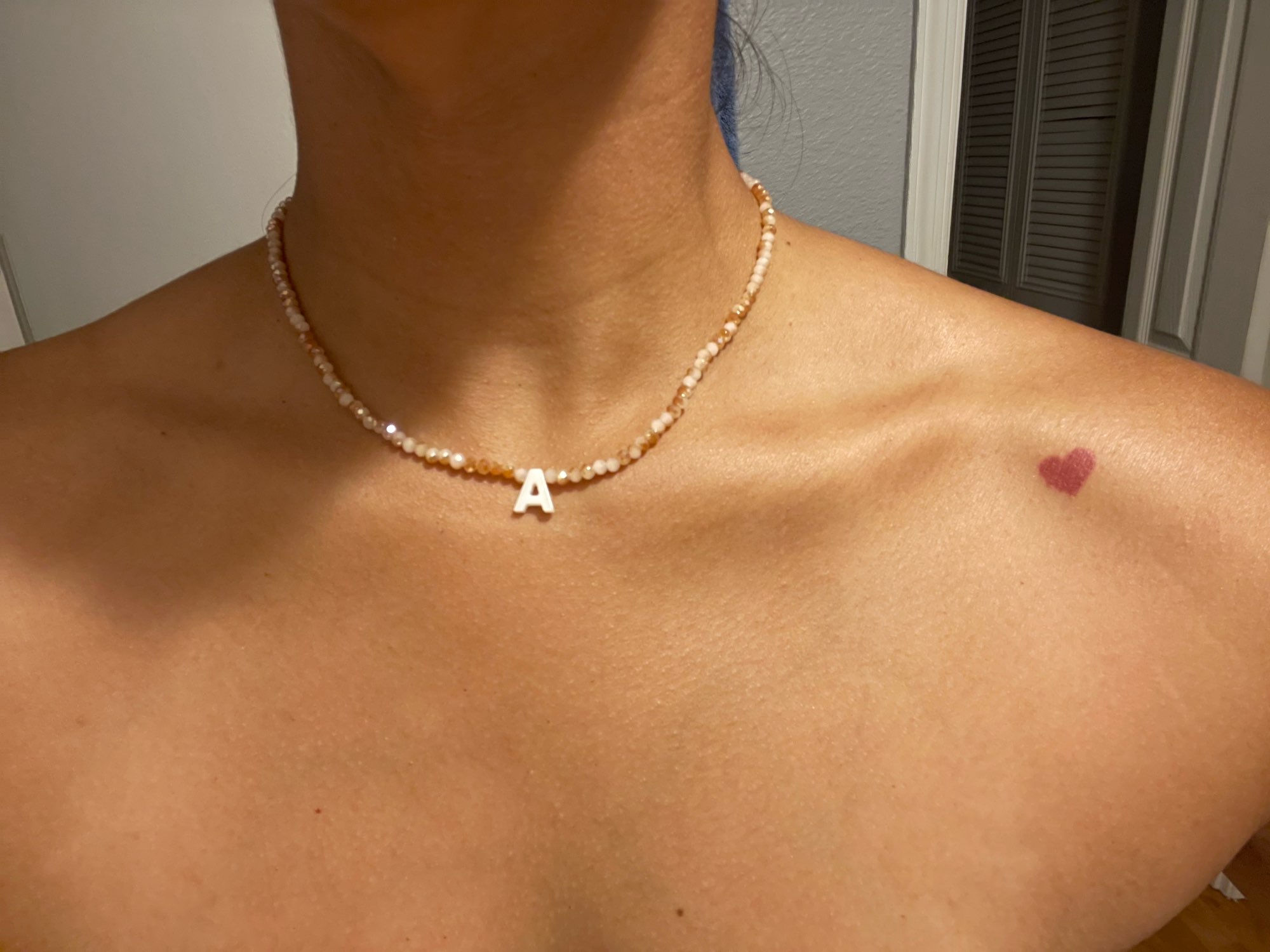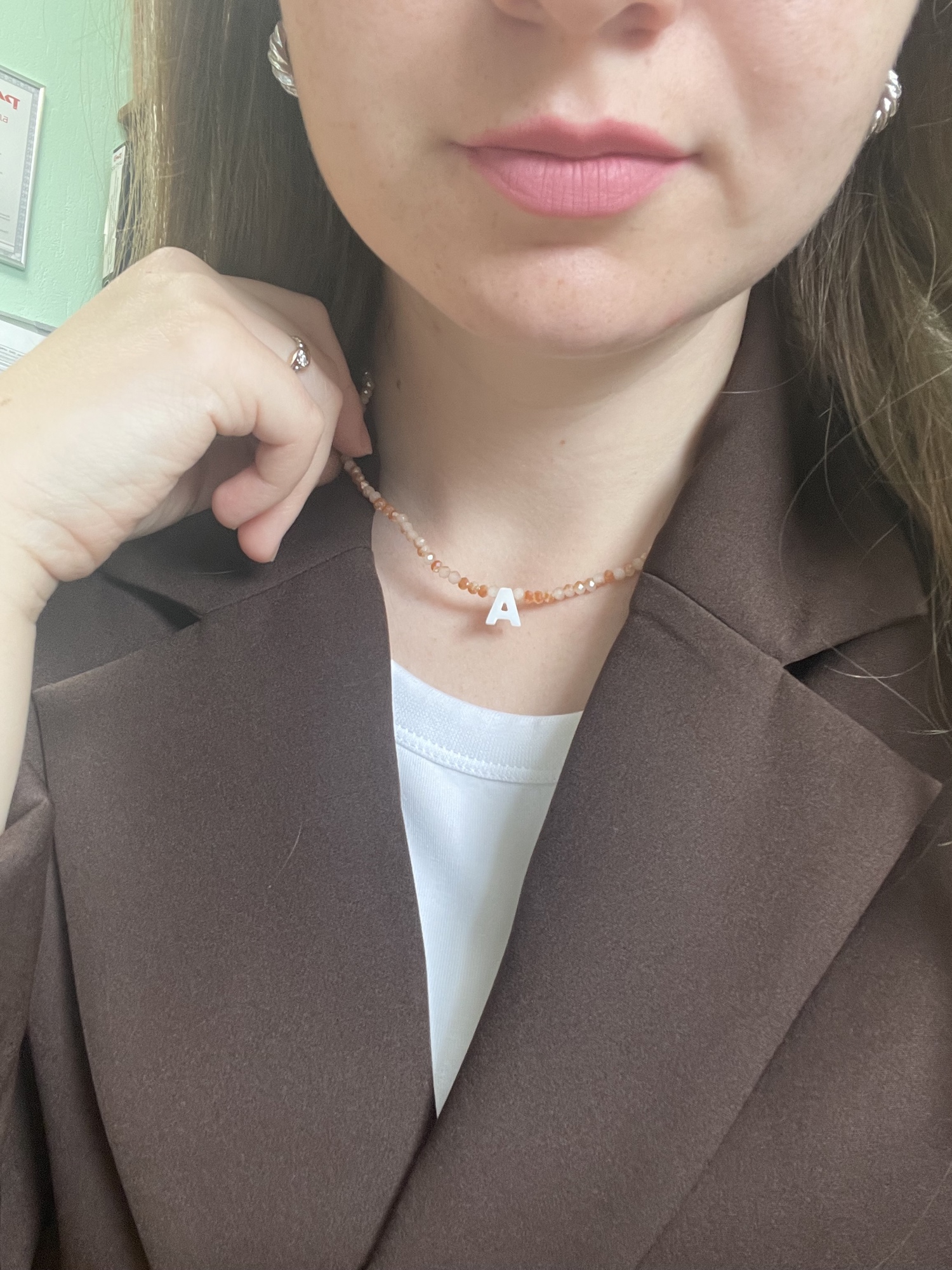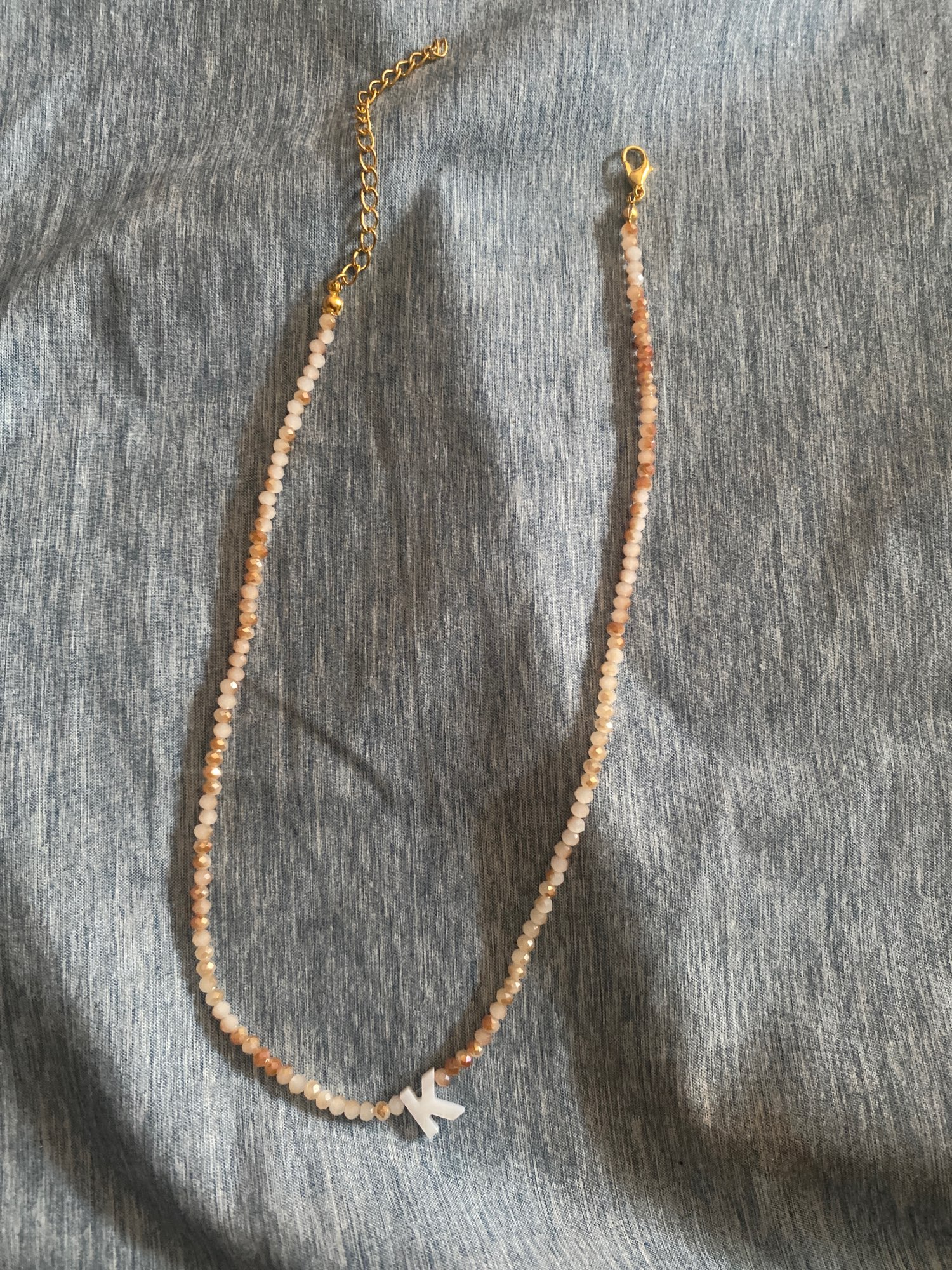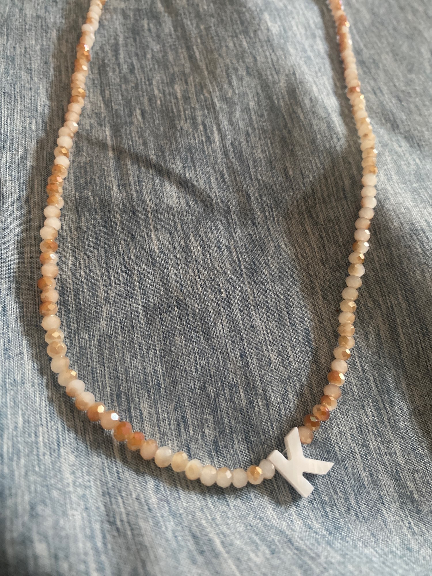 Very good necklace, very beautiful and bright. Letter in mother of pearl.