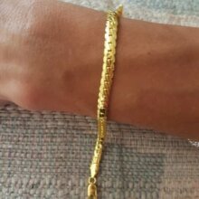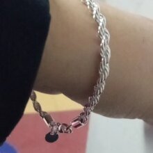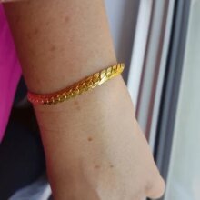 The delivery is fast. Too yellow, and not like gold, but let's see when wearing it, it may dim. The size is good, the weaving is interesting!