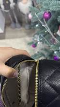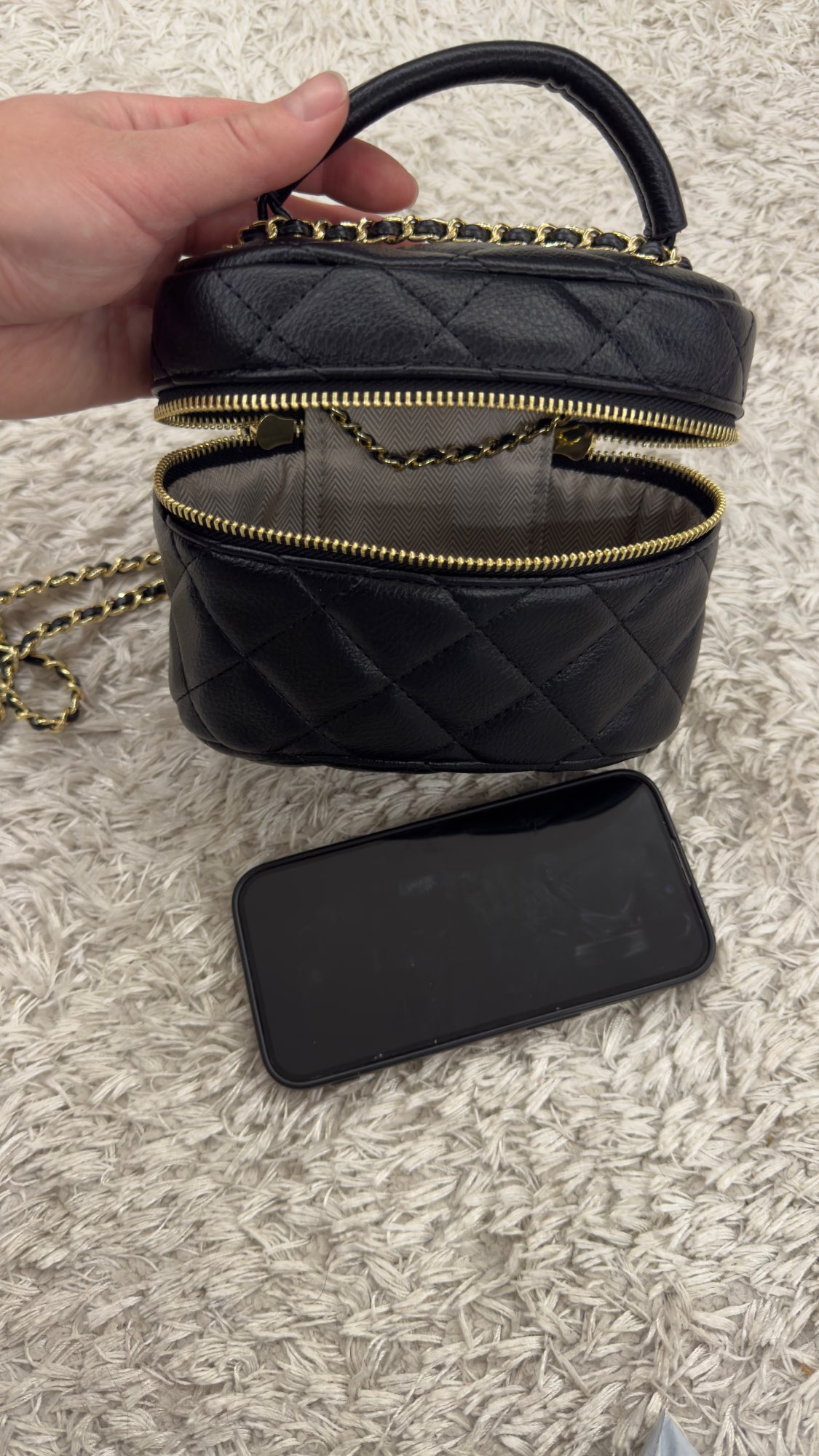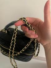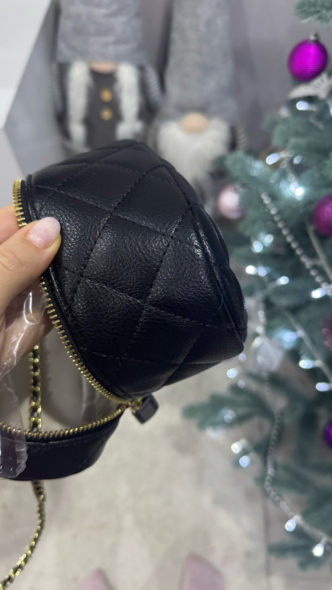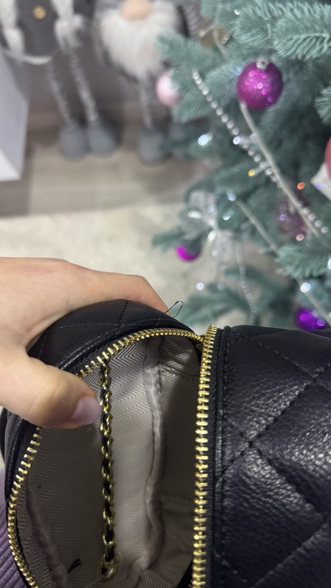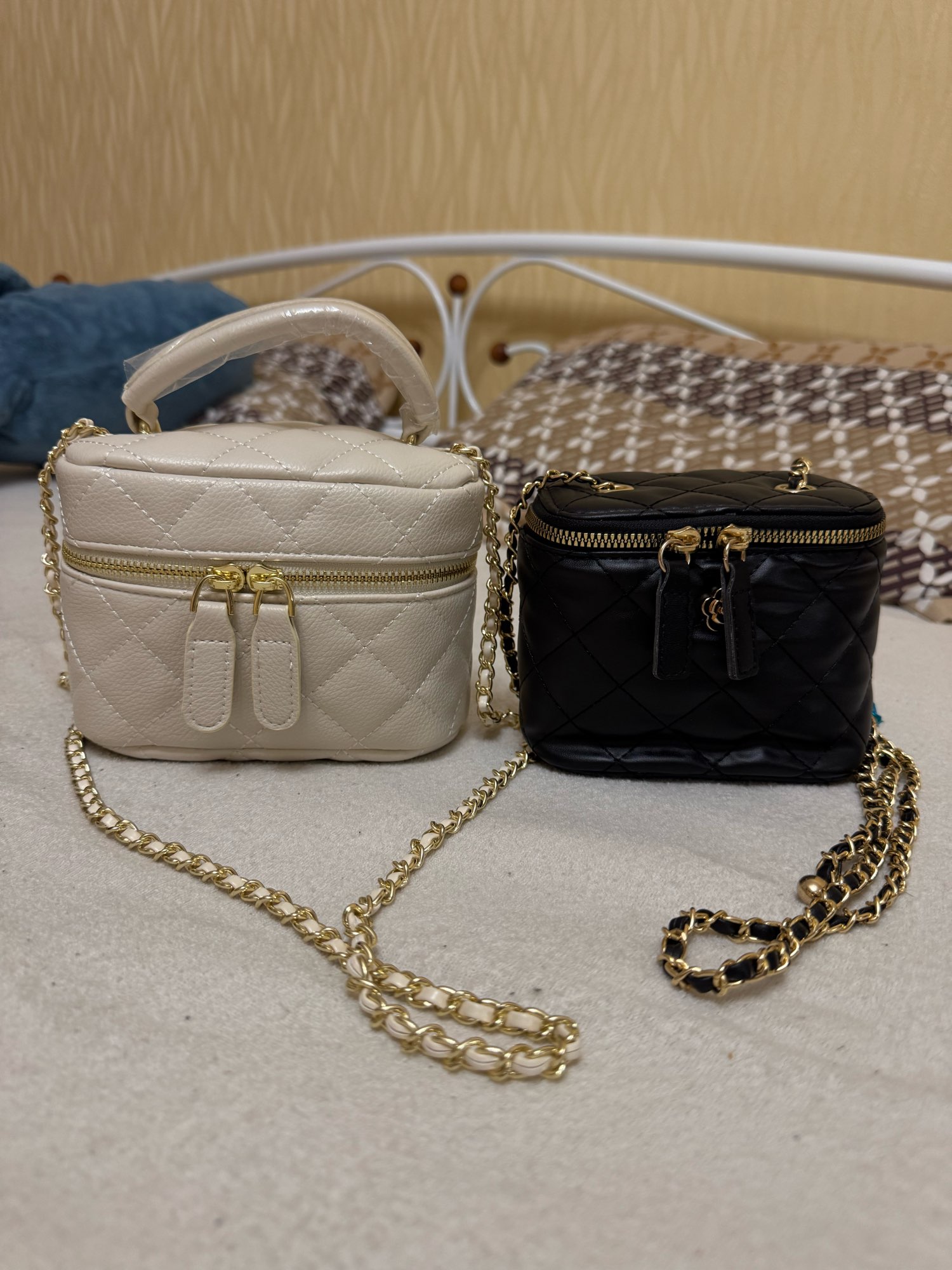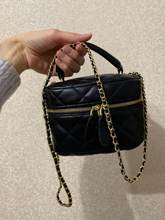 Чудова маленька сумочка😍Ланцюжок металевий, важкенький. Колір фурнітури ближче до лимонного золота. iPhone 15 pro поміщається з легкістю, а от pro max влазить, але розпирає з боків. Купувала 11.11, прийшла за 17 днів спільною посилкою з іншими замовленнями. Рекомендую👍🏻