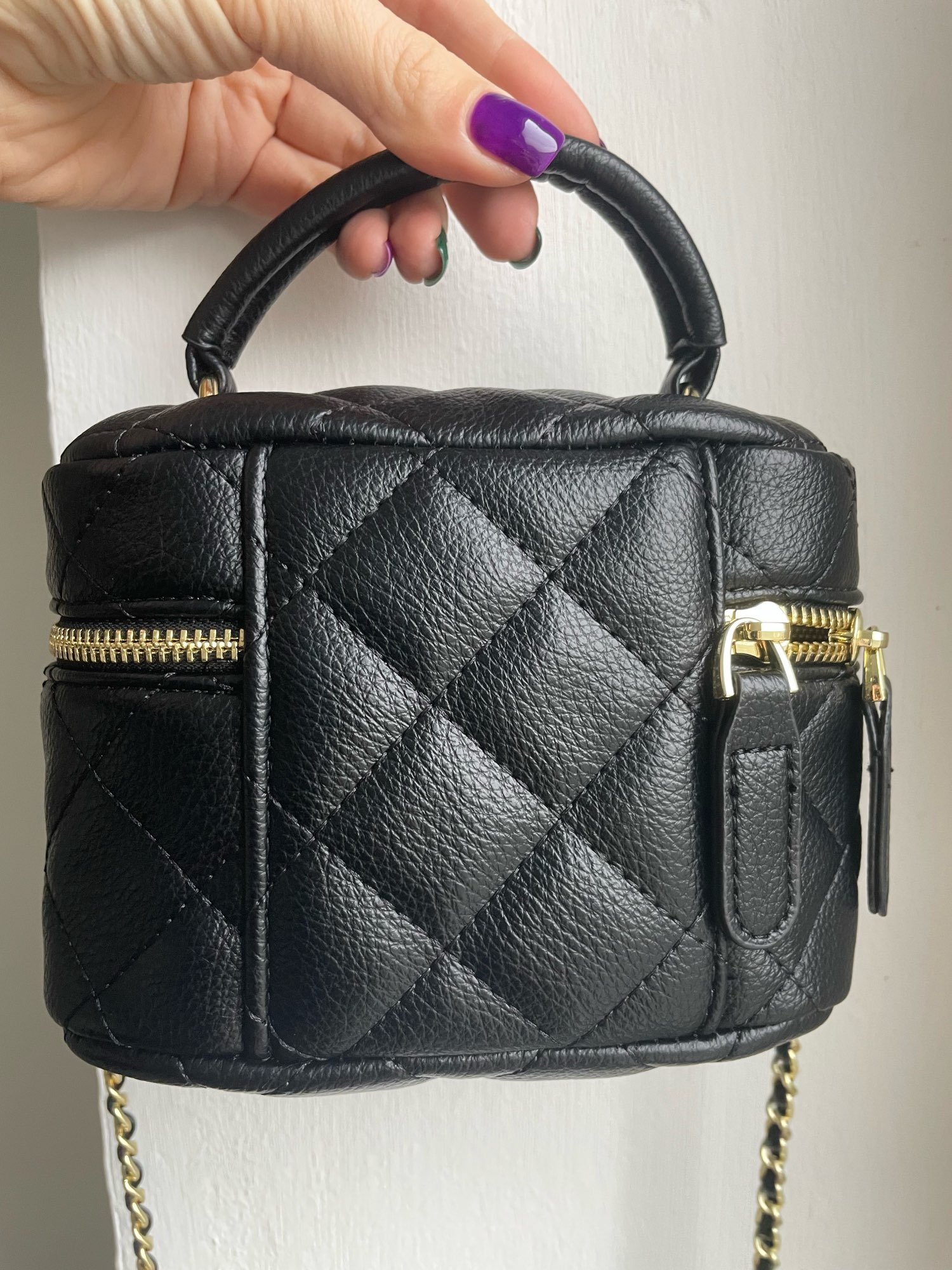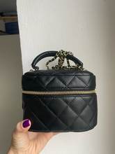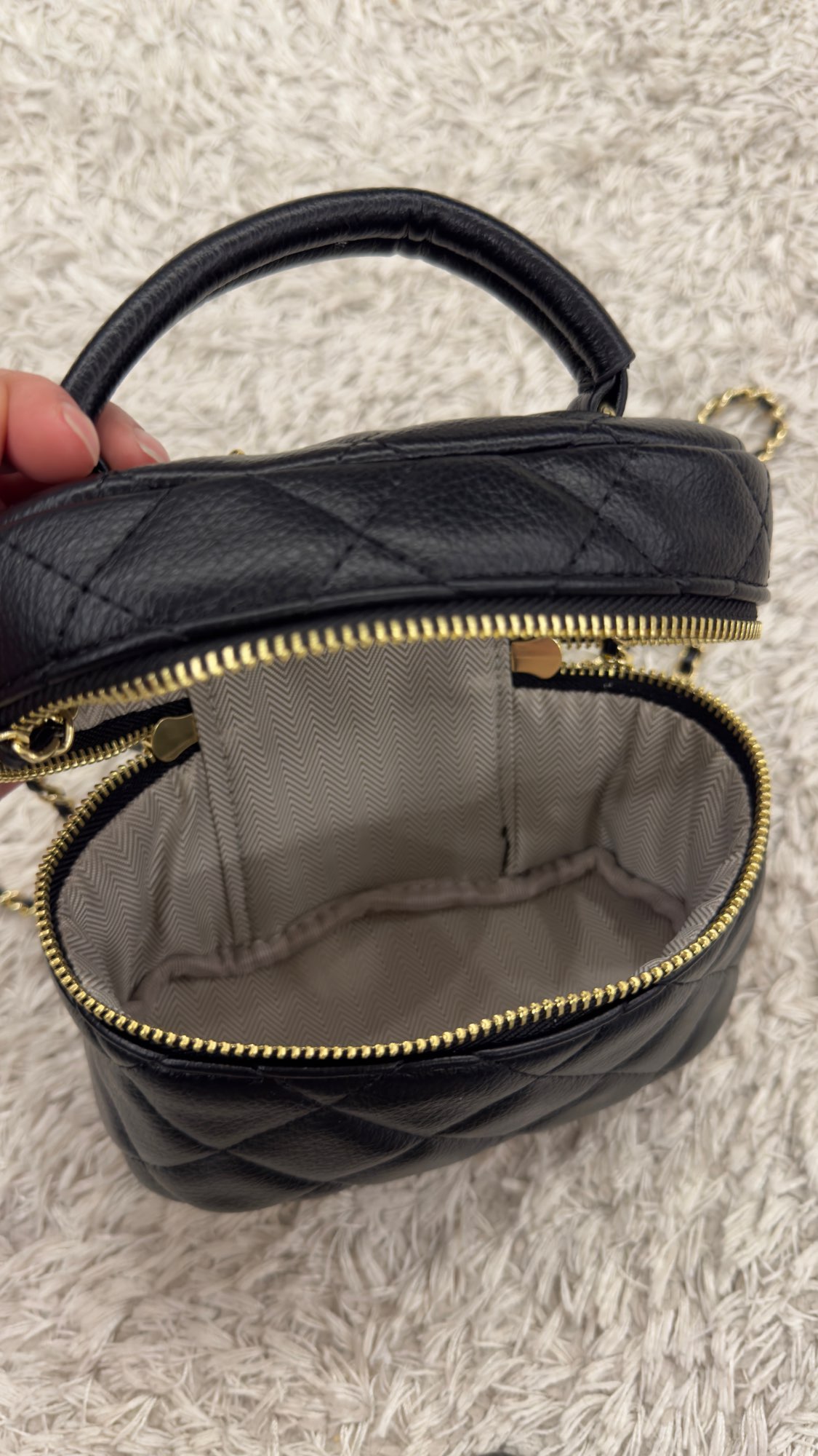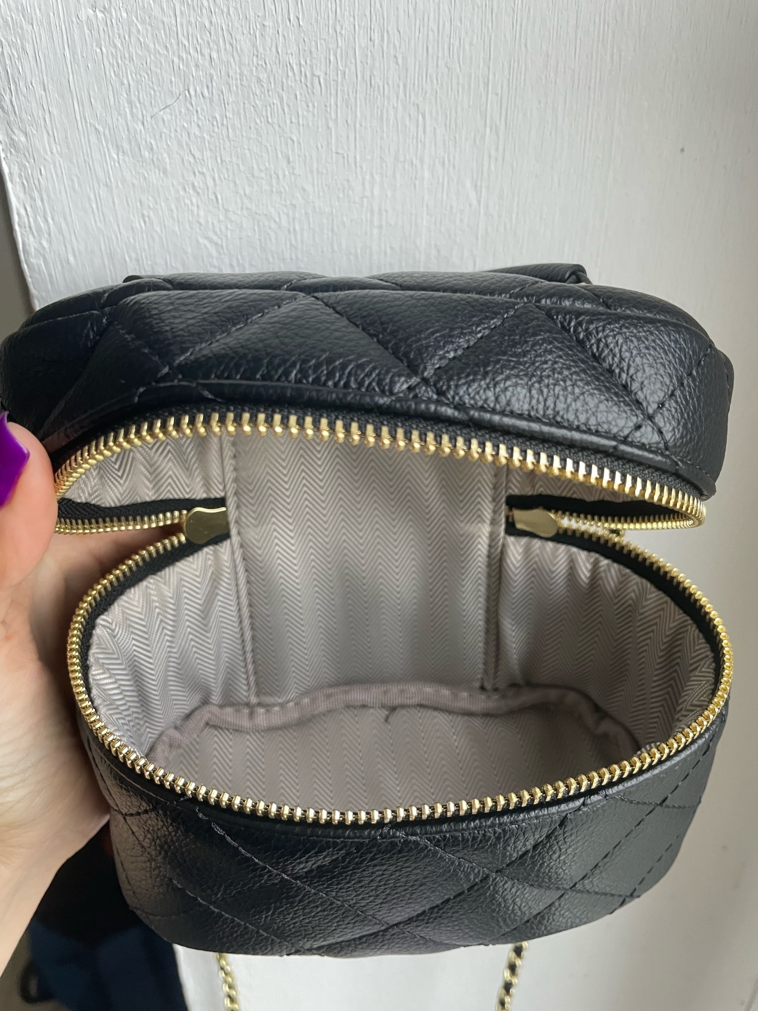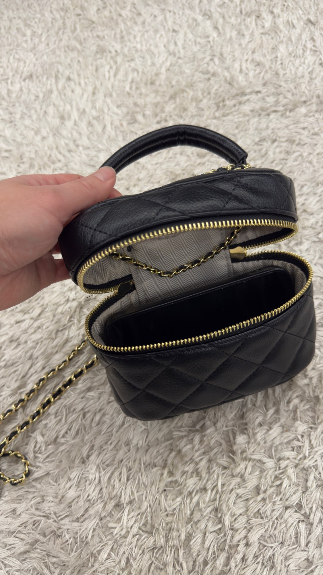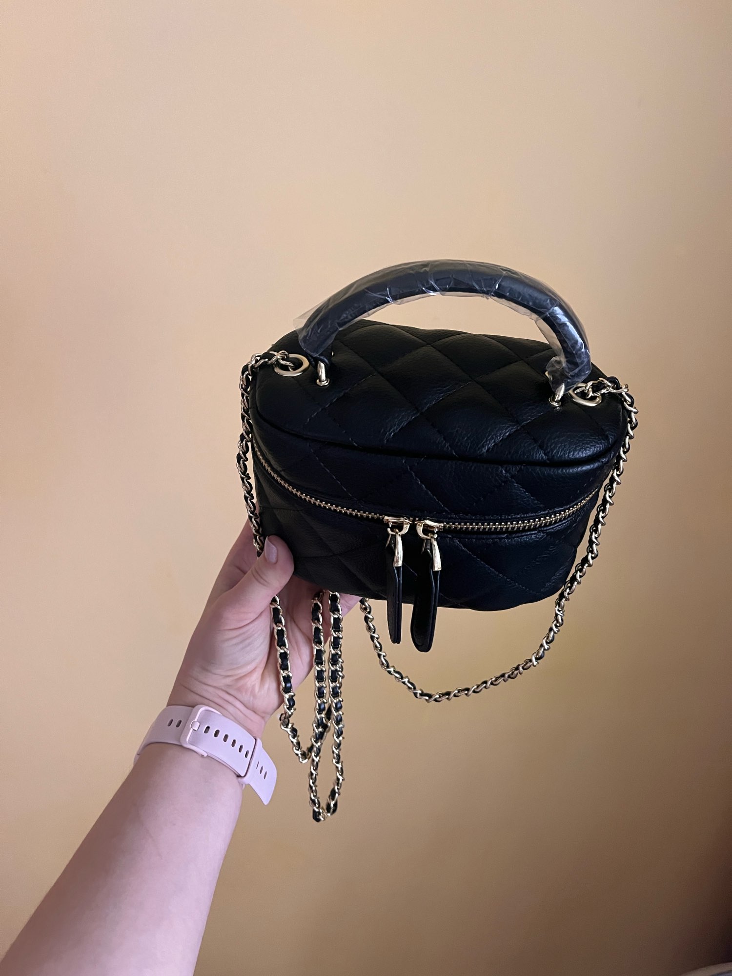 Чудова маленька сумочка😍Ланцюжок металевий, важкенький. Колір фурнітури ближче до лимонного золота. iPhone 15 pro поміщається з легкістю, а от pro max влазить, але розпирає з боків. Купувала 11.11, прийшла за 17 днів спільною посилкою з іншими замовленнями. Рекомендую👍🏻