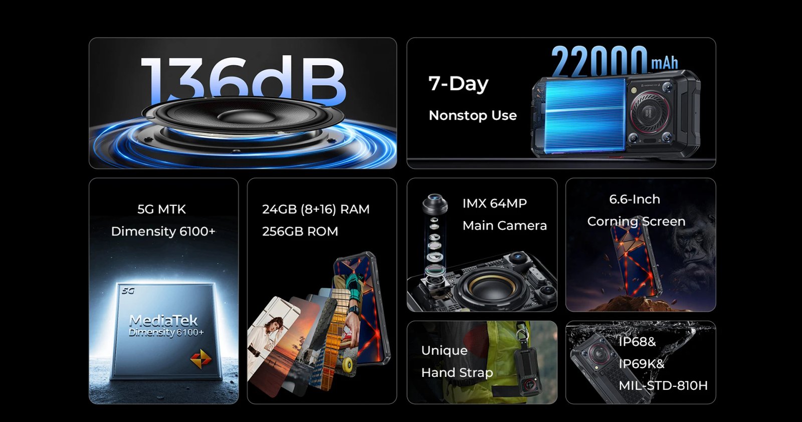136dB Multimedia Speaker (5W)|7-Day Nonstop Use|5G MTK Dimensity 6100+|24GB (8+16) RAM+256GB ROM|IMX 64MP Main Camera|6.6-Inch Corning Screen|Unique Hand Strap|IP68&IP69K&MIL-STD-810H