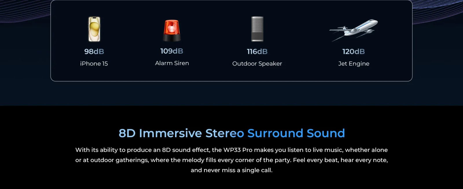 With its ability to produce an 8D sound effect, the WP33 Pro makes you listen to live music, whether alone or at outdoor gatherings, where the melody fills every corner of the party. Feel every beat, hear every note, and never miss a single call.