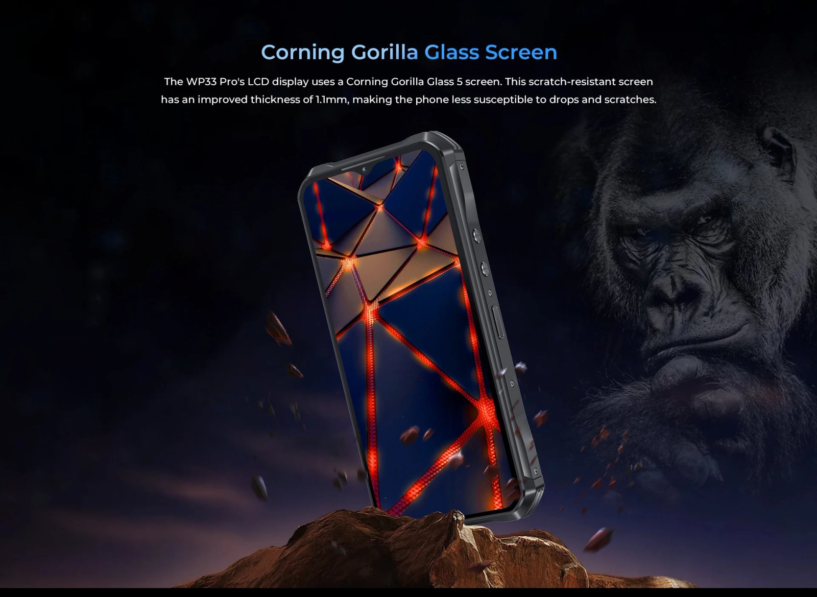 The WP33 Pro’s LCD display uses a Corning Gorilla Glass 5 screen. This scratch-resistant screen has an improved thickness of 1.1mm, making the phone less susceptible to drops and scratches.
