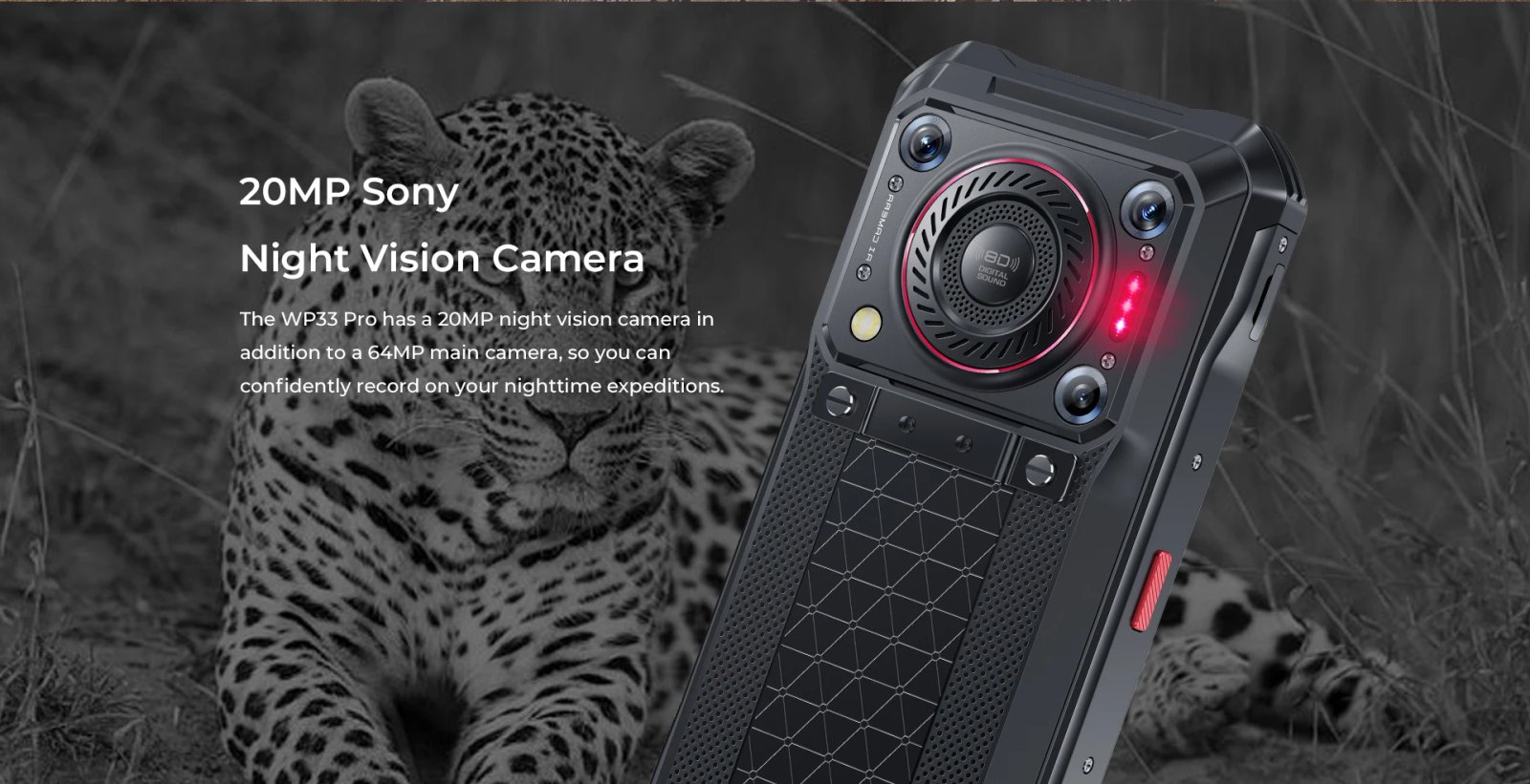 The WP33 Pro has a 20MP night vision camera in addition to a 64MP main camera, so you can confidently record on your nighttime expeditions.