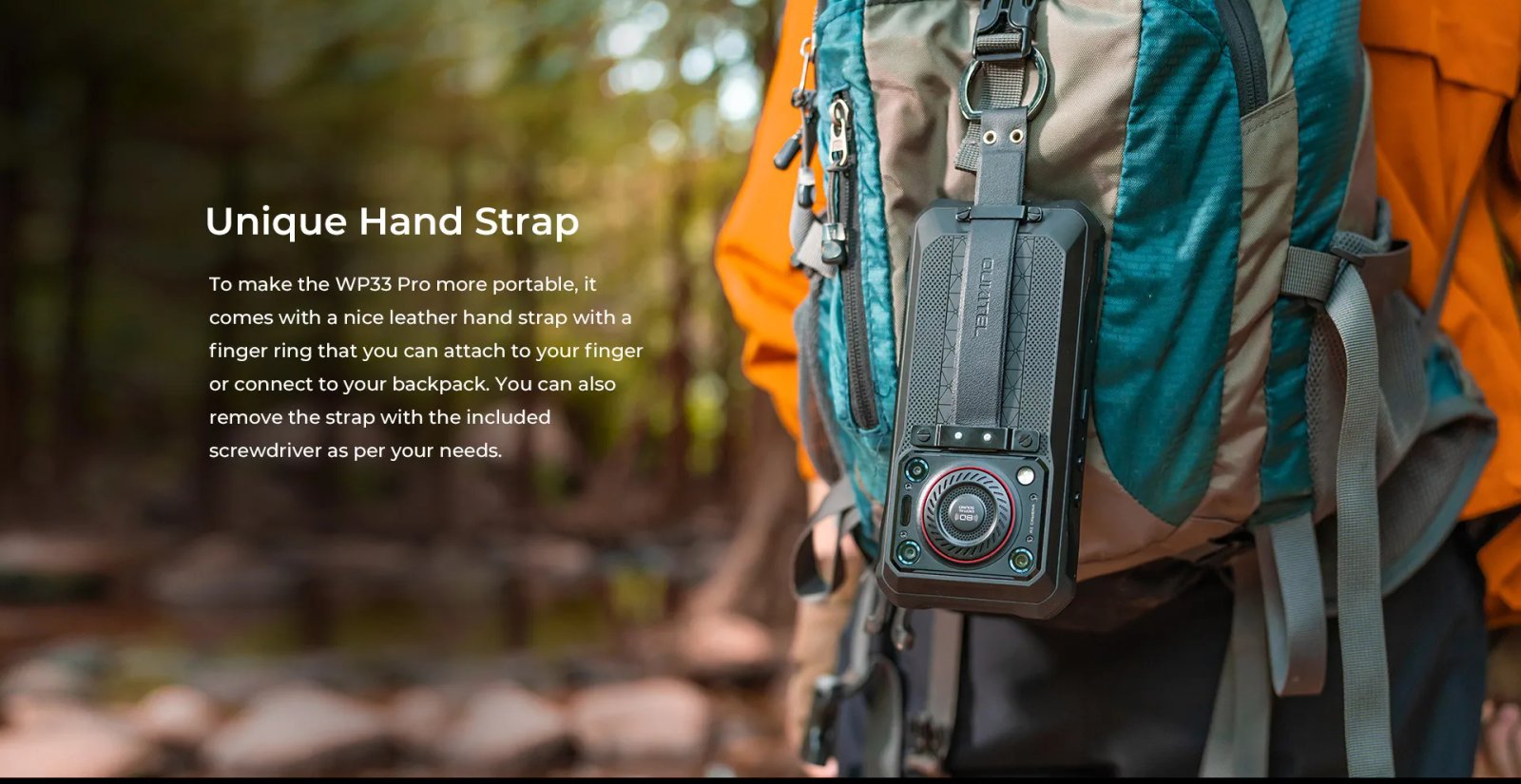 To make the WP33 Pro more portable, it comes with a nice leather hand strap with a finger ring that you can attach to your finger or connect to your backpack. You can also remove the strap with the included screwdriver as per your needs.