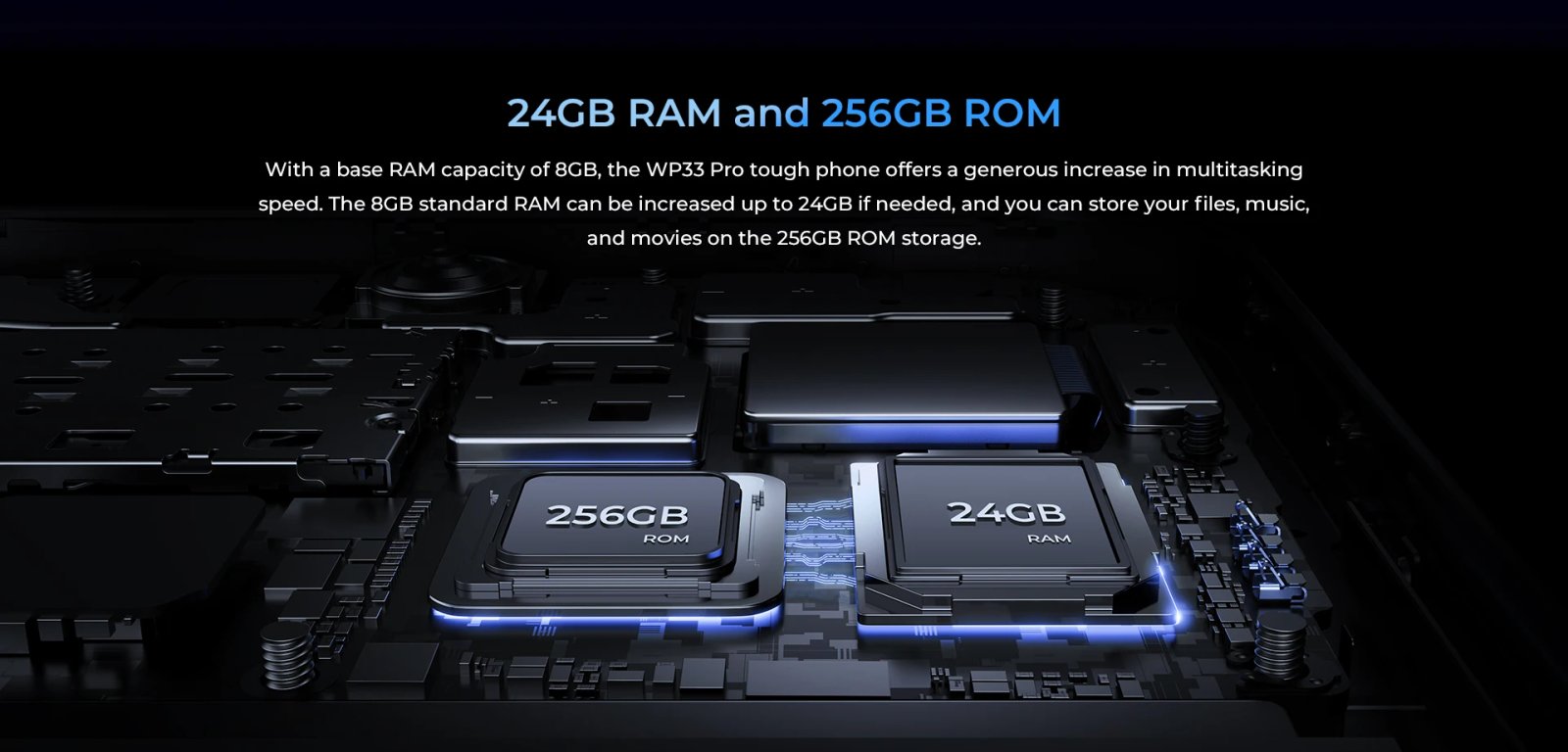 With a base RAM capacity of 8GB, the WP33 Pro tough phone offers a generous increase in multitasking speed. The 8GB standard RAM can be increased up to 24GB if needed, and you can store your files, music, and movies on the 256GB ROM storage.