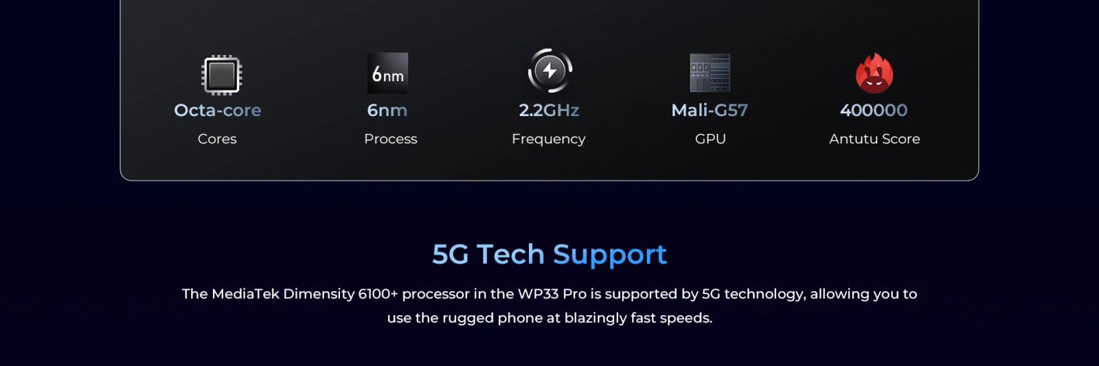 The MediaTek Dimensity 6100+ processor in the WP33 Pro is supported by 5G technology, allowing you to use the rugged phone at blazingly fast speeds.