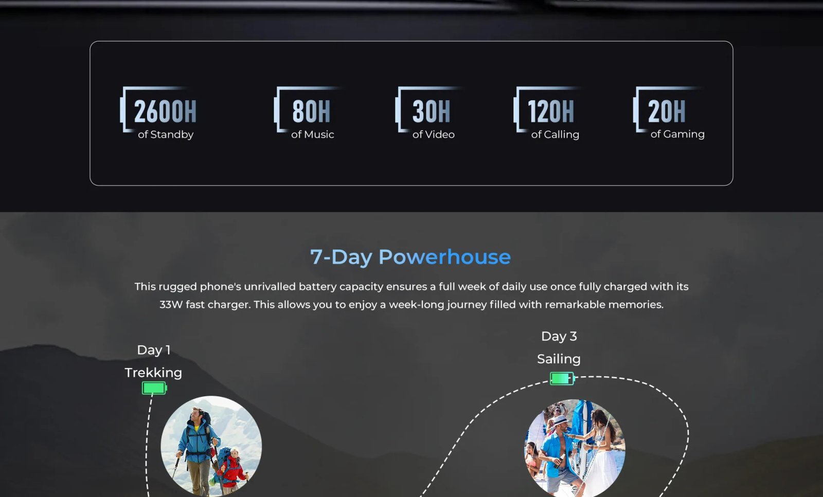 This rugged phone’s unrivalled battery capacity ensures a full week of daily use once fully charged with its 33W fast charger. This allows you to enjoy a week-long journey filled with remarkable memories.