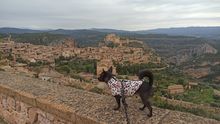le está perfecto y de muy buena calidad, pesa 5kg.es muy cómodo de poner y le cubre casi toda la espalda (ella es muy larga)