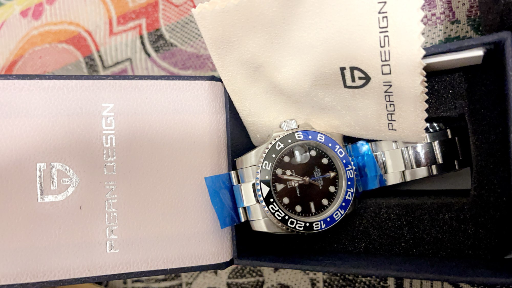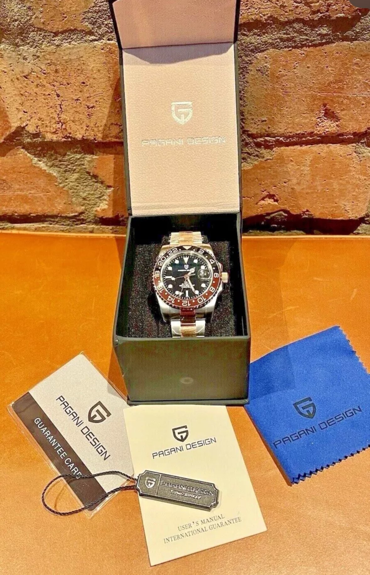 PAGANI DESIGNS first dual time zone chronograph with GMT function, 40mm stainless steel case with black-blue bezel, rotating ceramic bezel and black dial, sapphire crystal that protrudes like a magnifying glass and allows a clear view. Wearing this watch, you can not only see its softness and joy in real life, but also feel the infinite imagination of an extraordinary journey. The GMT hour hand is a thoughtful solution to jet lag problems. Its excellent function, reliable performance and unique aesthetic design make it very popular among tourists and a must-have global travel watch.
