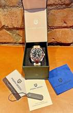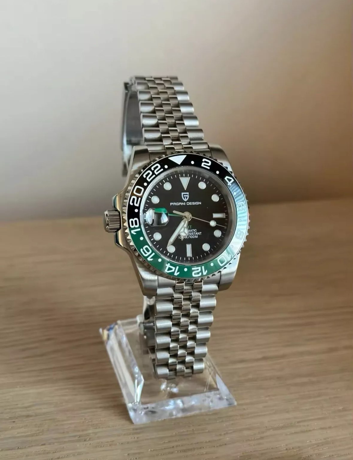 The PAGANI DESIGN V4 GMT Watch exudes luxury with its sleek stainless steel casing and sapphire glass, offering a sophisticated look for any occasion.
