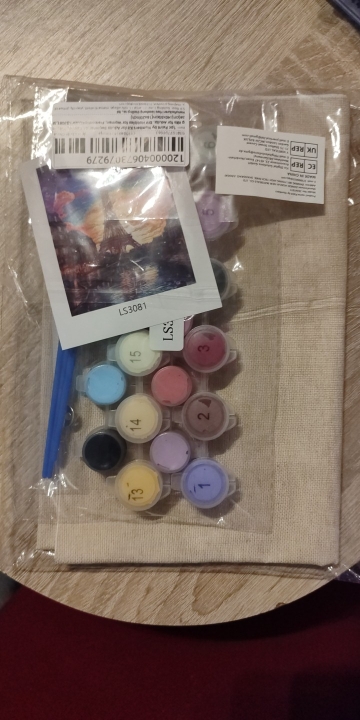 El cuadro que llegó coincide con la descripción del producto, viene con los correspondientes pinturas y pinceles. Satisfecho con la compra.
