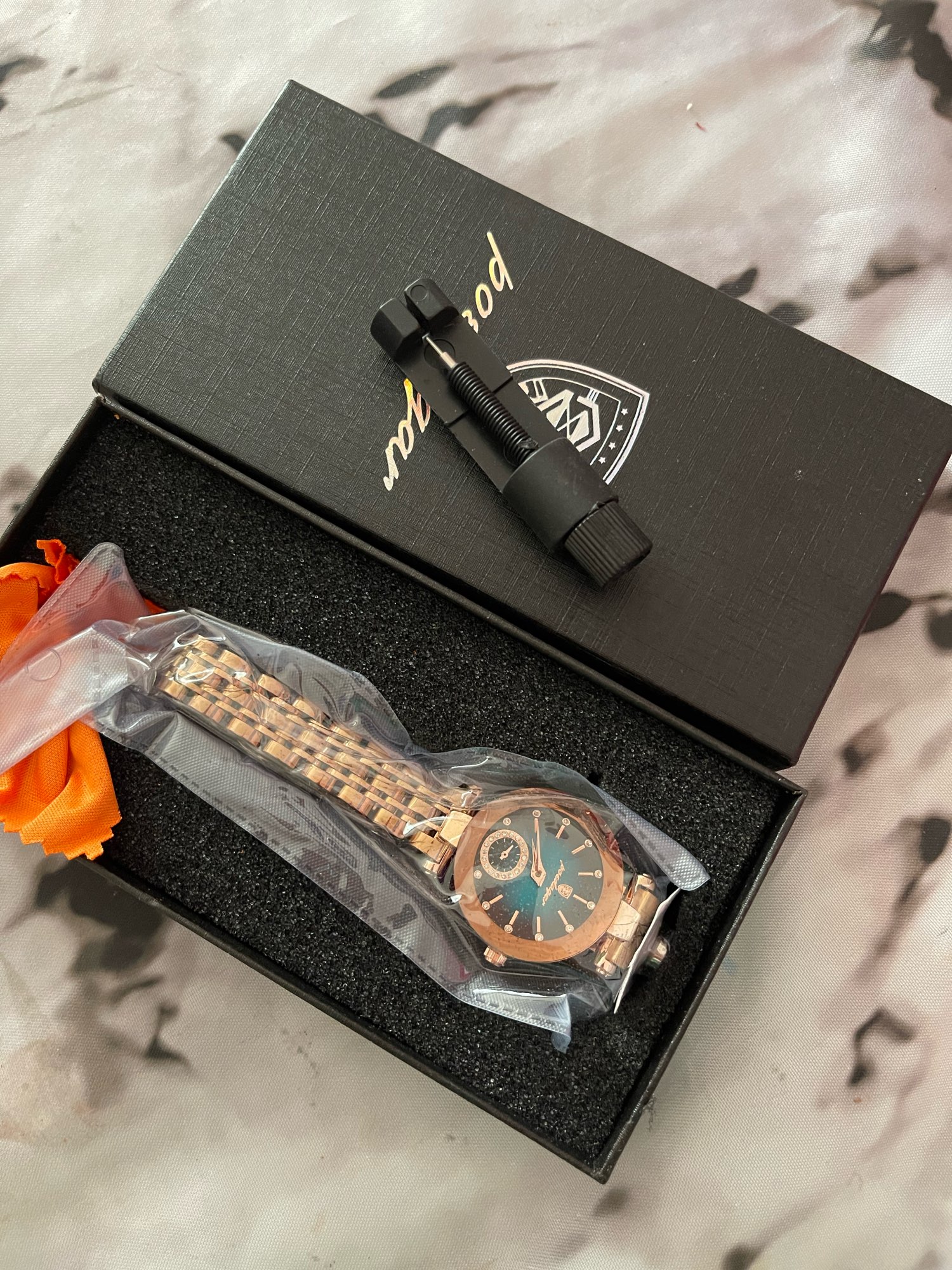 The watch is chic. very beautiful, amazing. came in a gift box. fit in size. very beautiful for gift
