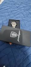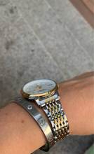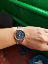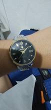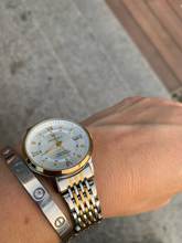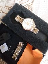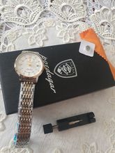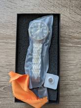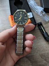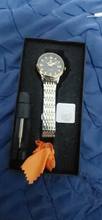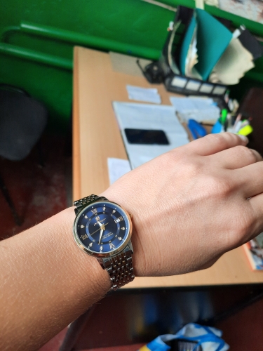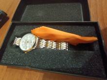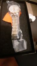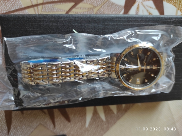 Received the parcel a couple of days earlier than the announced one, the store paid for the services of the new mail, the parcel office. Everything is fine, there is fabric, there is a device for removing links, I will not risk it myself, I will go to the master better)))). The box is slightly damaged, if for a gift, it would be rebuilt, I don't know because of whose fault, the seller or deliveries, Mail. The clock went on, worked on the way.