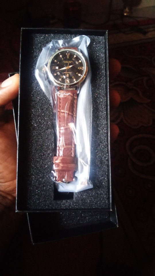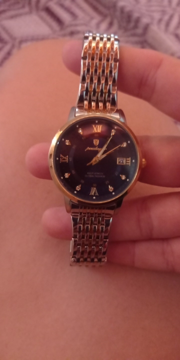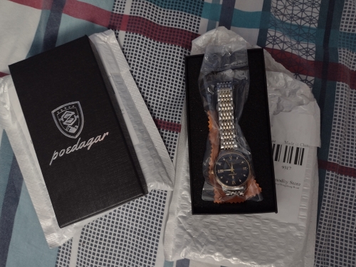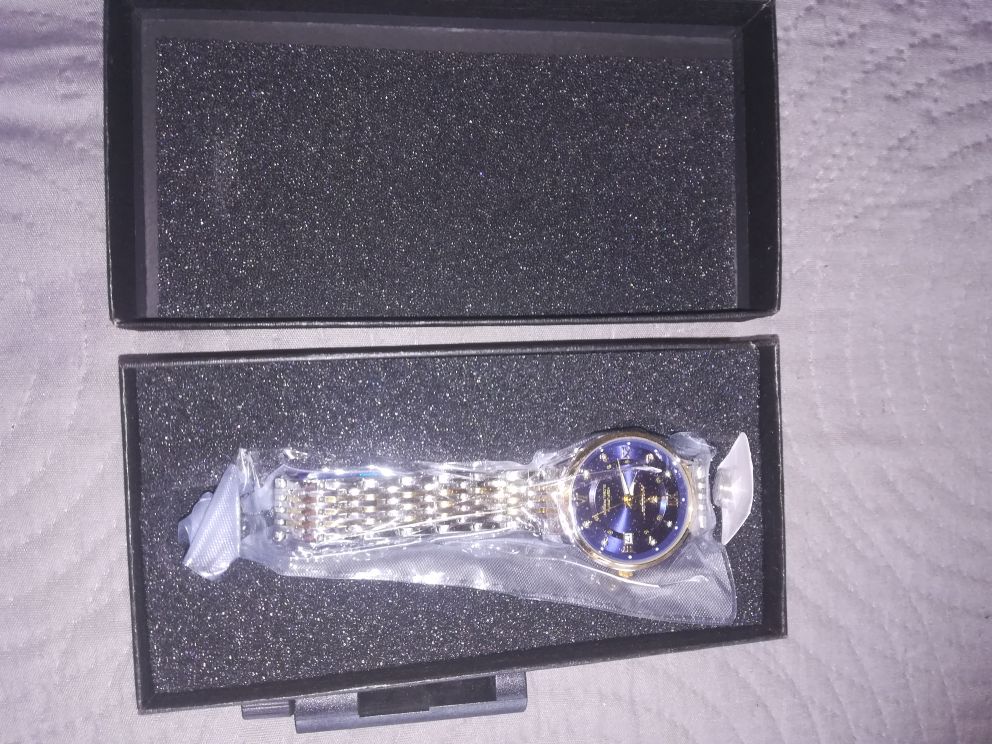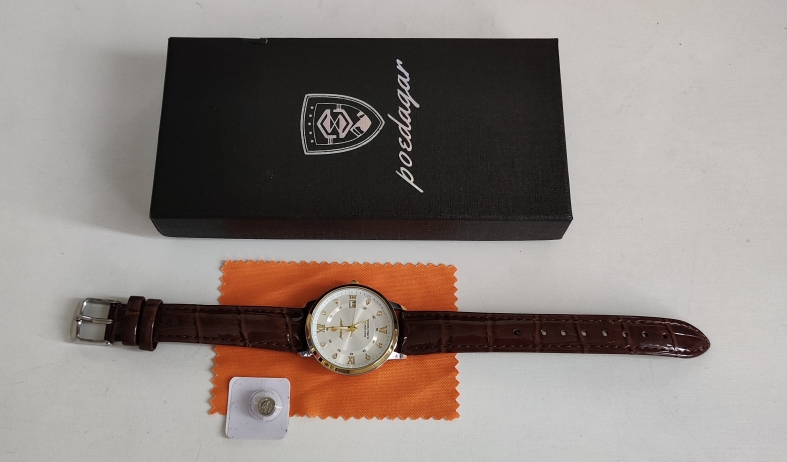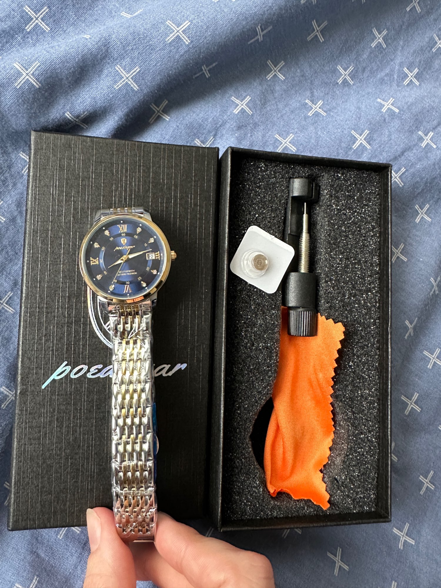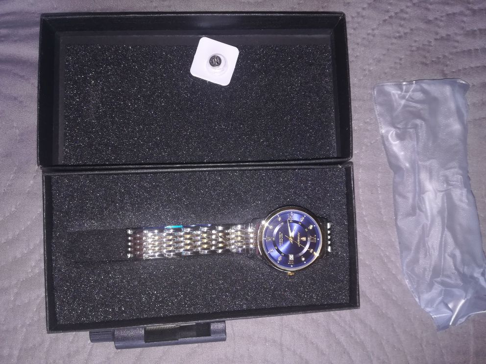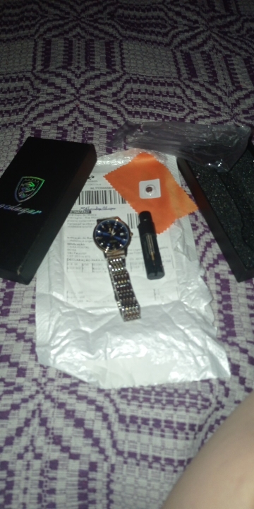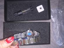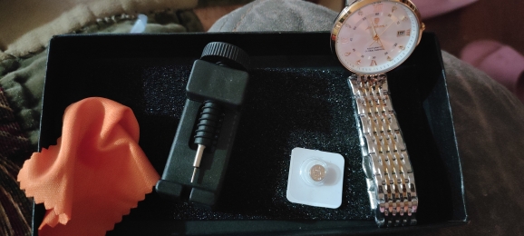 A very nice watch! Clean, clear and lovely time and calendar display. Came with a bracelet adjuster, a spare battery and a tiny cloth for cleaning. Thanks, Sellers. I recommend both the watch and the Seller.